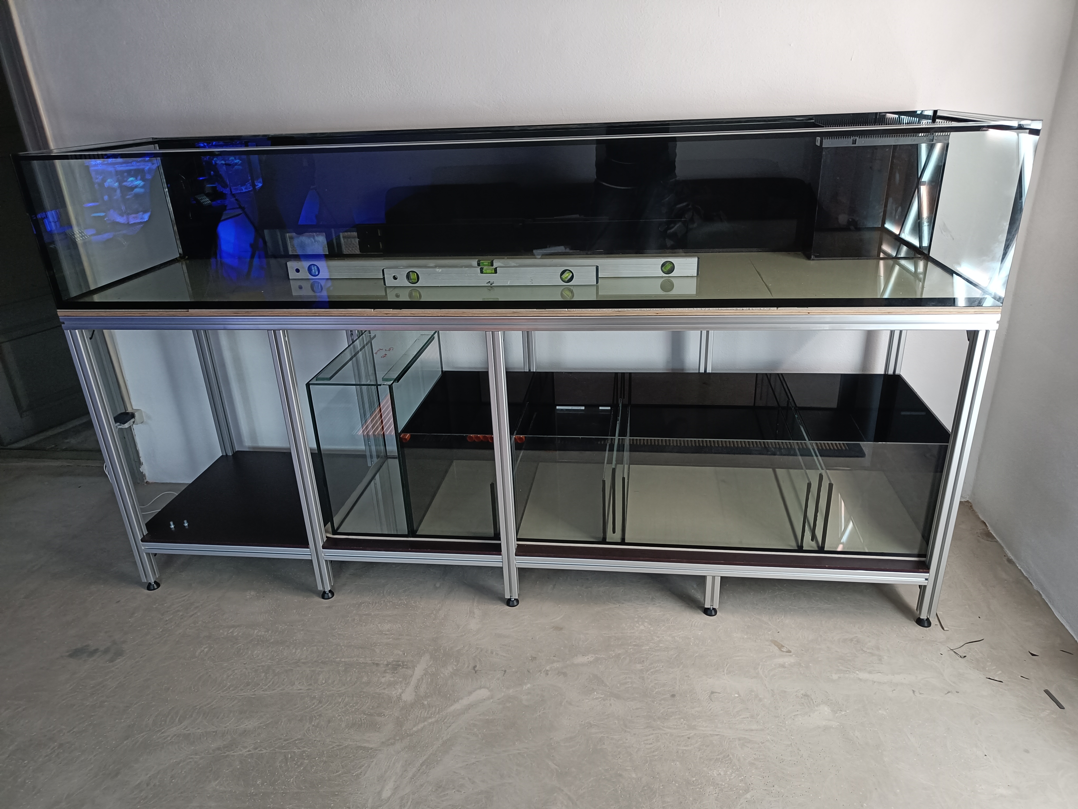 Jeg har i denne omgang fået monteret folie på bagside af display samt på sider og bagside af sumpen. Jeg mangler stadig at få monteret folie på osmose tank. Akvariet er blevet flyttet ind på plads, samt justeret så alt er i vatter, og der ingen spændinger skulle være i hverken akvarie eller sump.