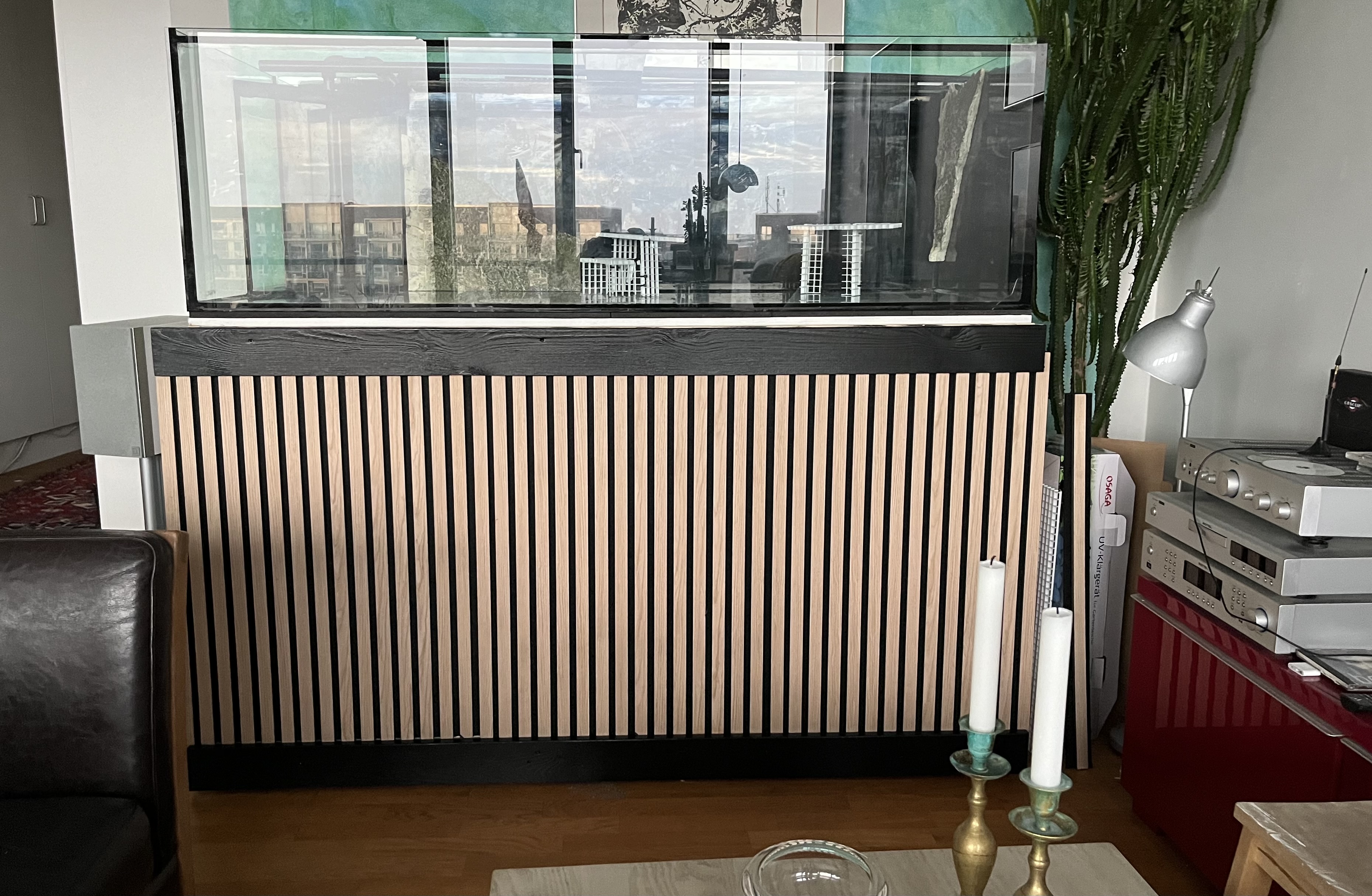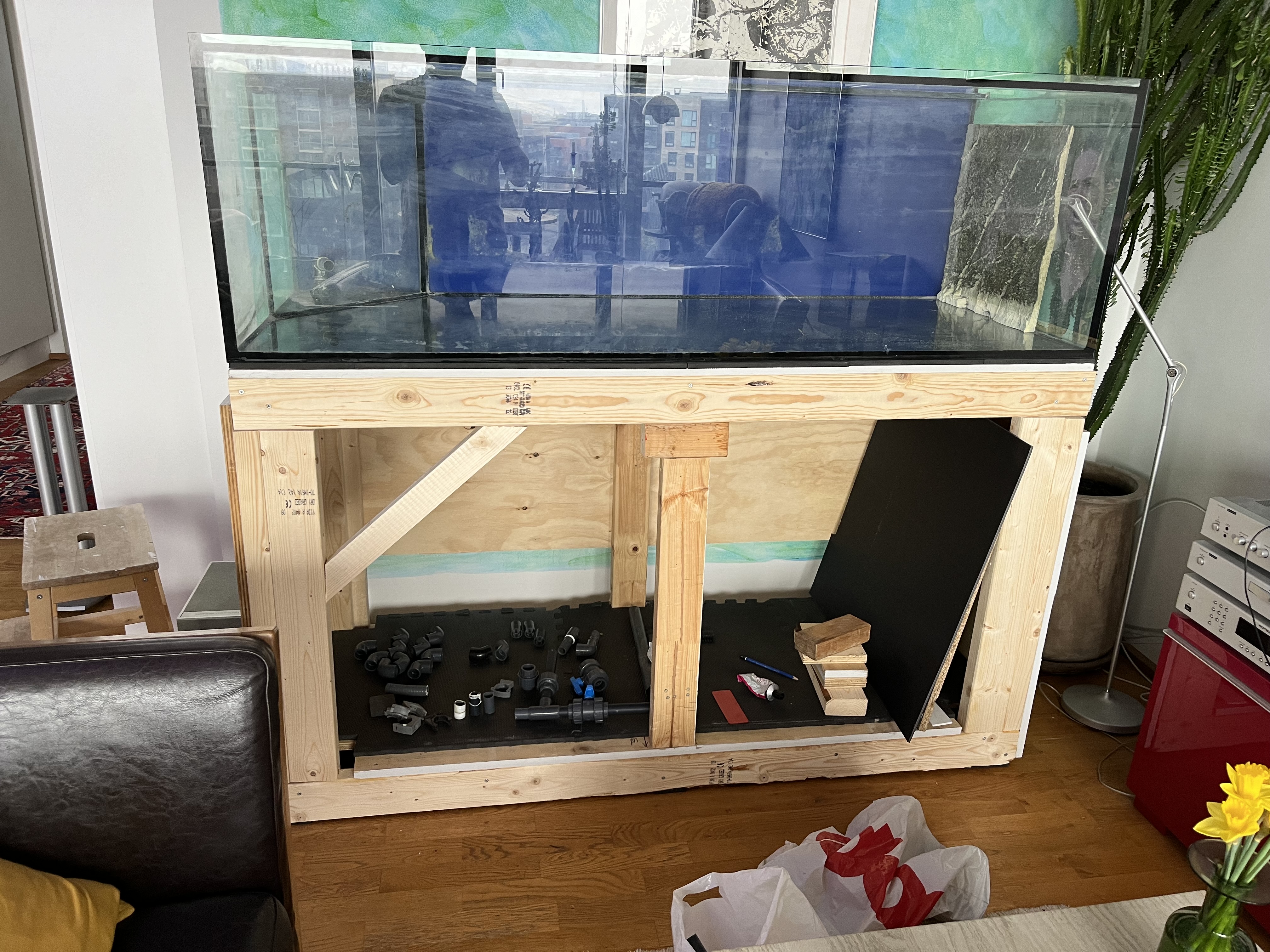 I øvrigt, På min flamingoplade under sumpen i skabet, hvor jeg gerne vil have alt til at være sort, har jeg lagt et enkelt lag sort tape langs kanten så man ikke ser det, eller det som minimum ligner en sort integreret pude. Det kan anbefales! Hvis du altså kan løfte akvariet endnu..
