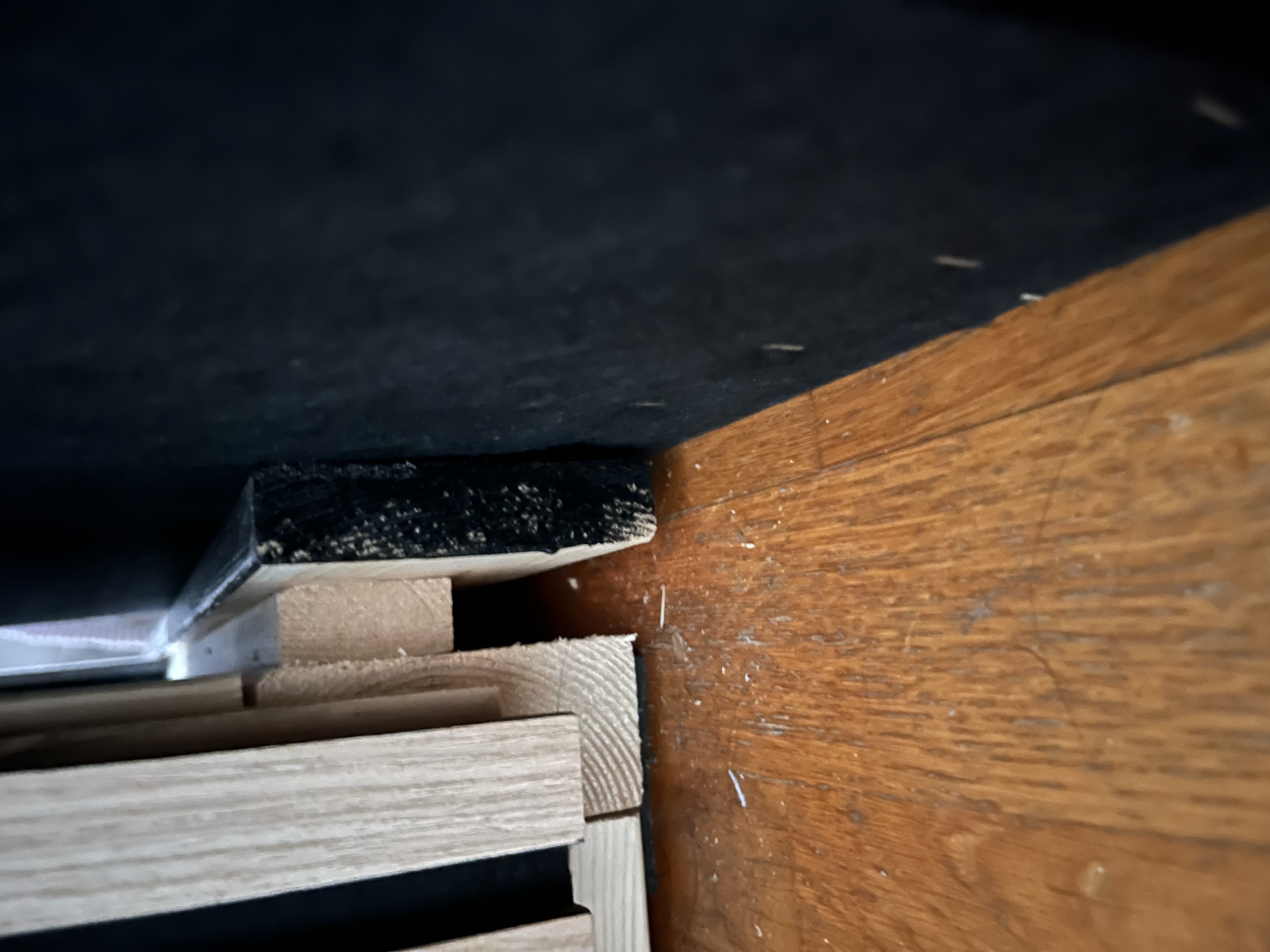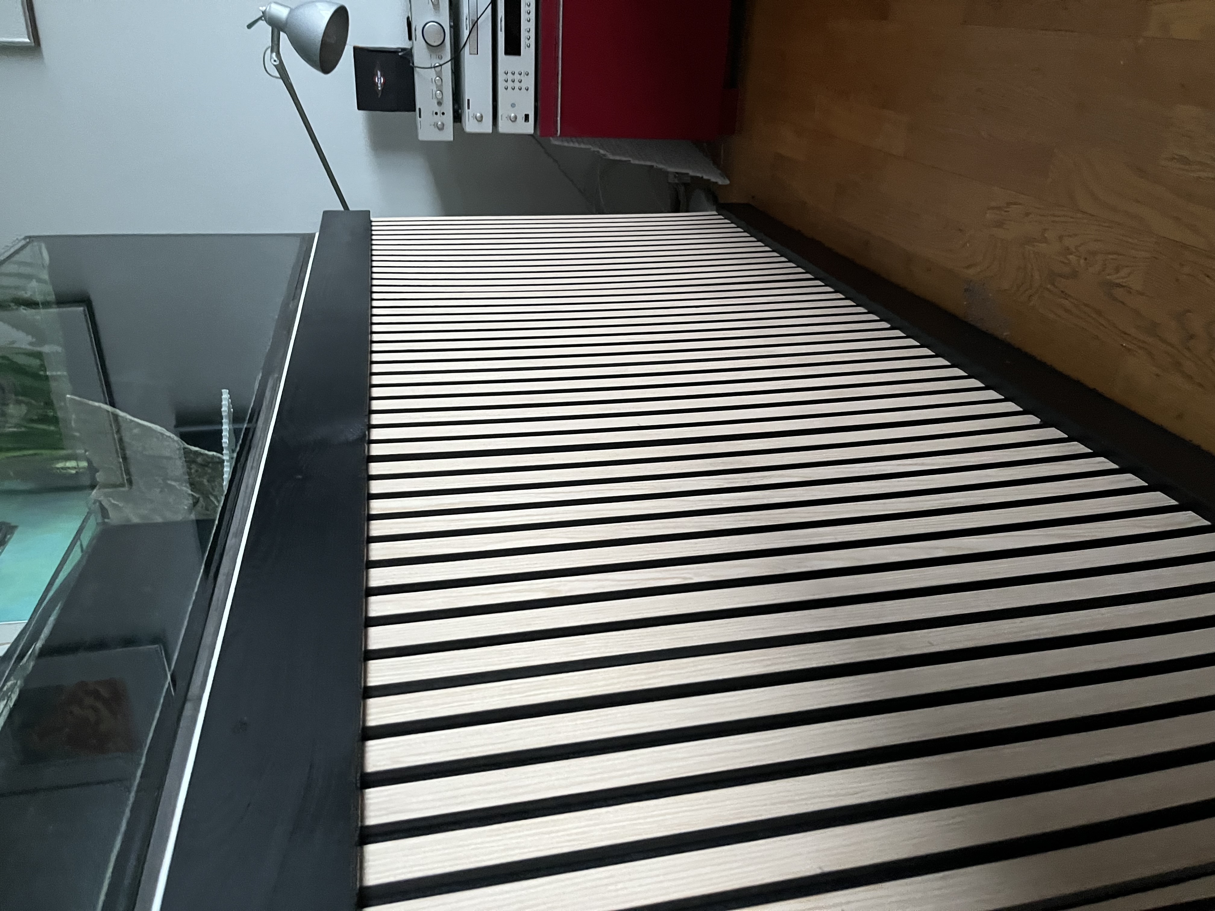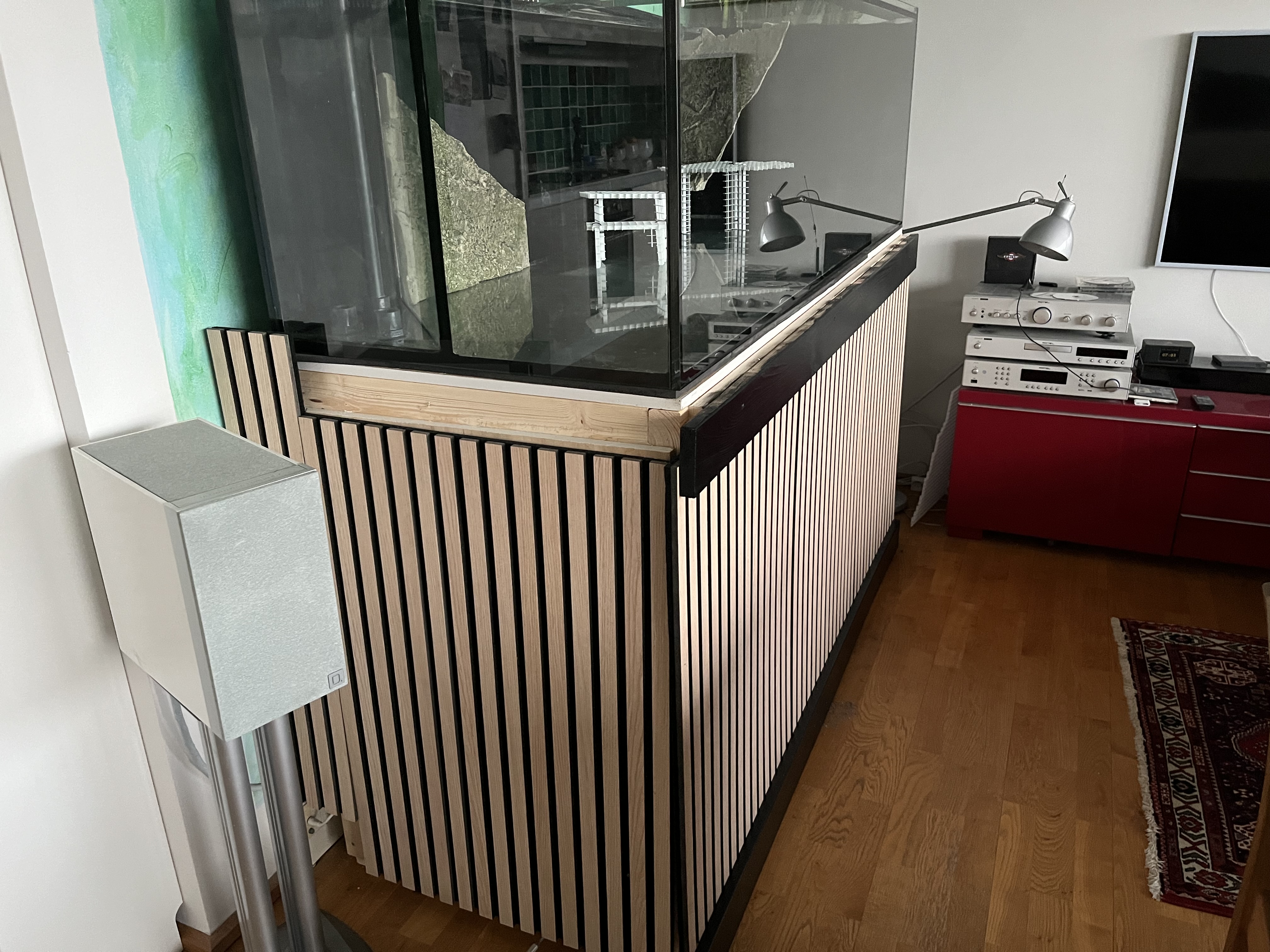Ift montering af akustikpladerne, så har jeg bare lavet det, som det ses på fotos. Som en “gammeldags” glas liste man bruger i fx terarrie. Afstand mellem de inderste lister er en del højre end akustikpladen/ (det der nu engang skal sidde i fronten) og de yderste brædder sidder med en højde afstand der er lidt mindre en højden på akustik pladerne. Den nederste inderste liste skal sidde i den højde man vil have som slut højde for front plader og så skal man lave luften/overhøjden øverst.
