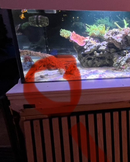 Det er IKKE en flamingo plade du ser, men siden af en gl 22 mm træ plade, som akvariet står på. Mellem den og akvariet er en 10 mm skumplade (sort). Kanterne på pladen og skumfidusen bliver skjult at det brædt der kommer til at fungerer som afslutning rundt om baljen. Som på det kørende system. Finder lige et foto og lægger det op 👍🏼