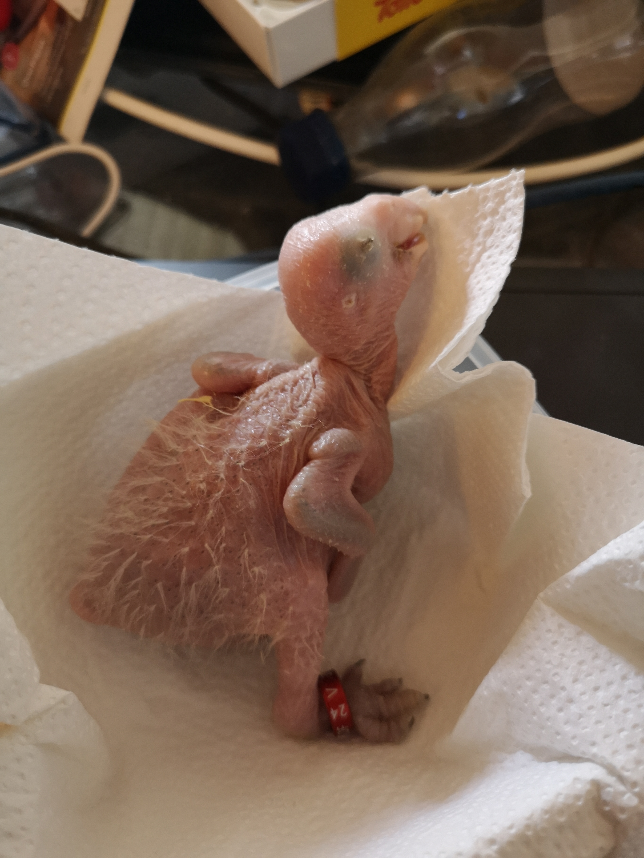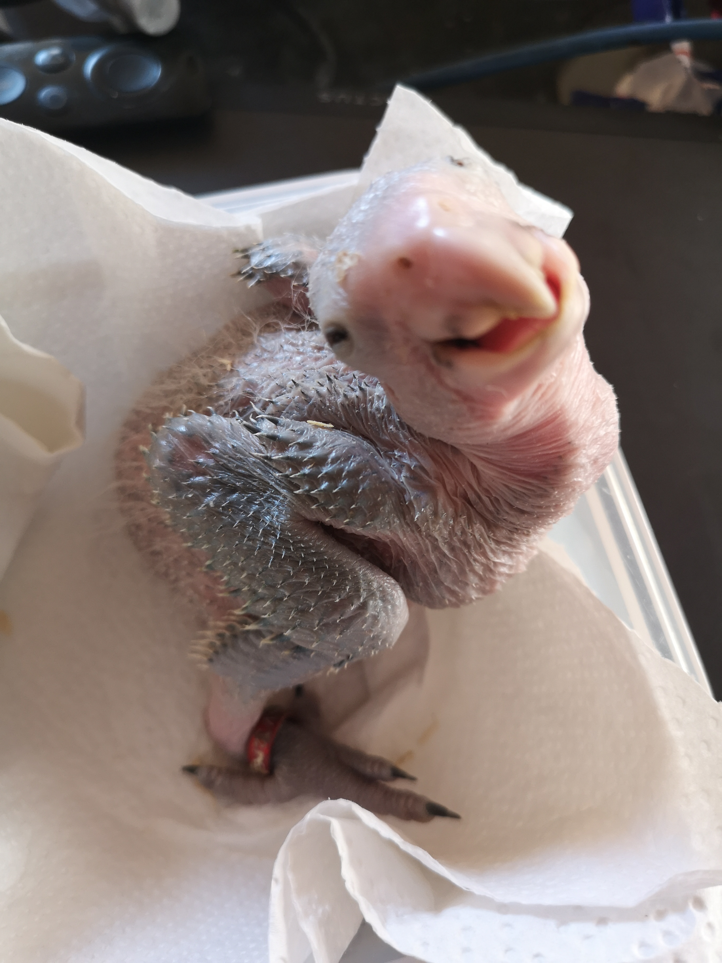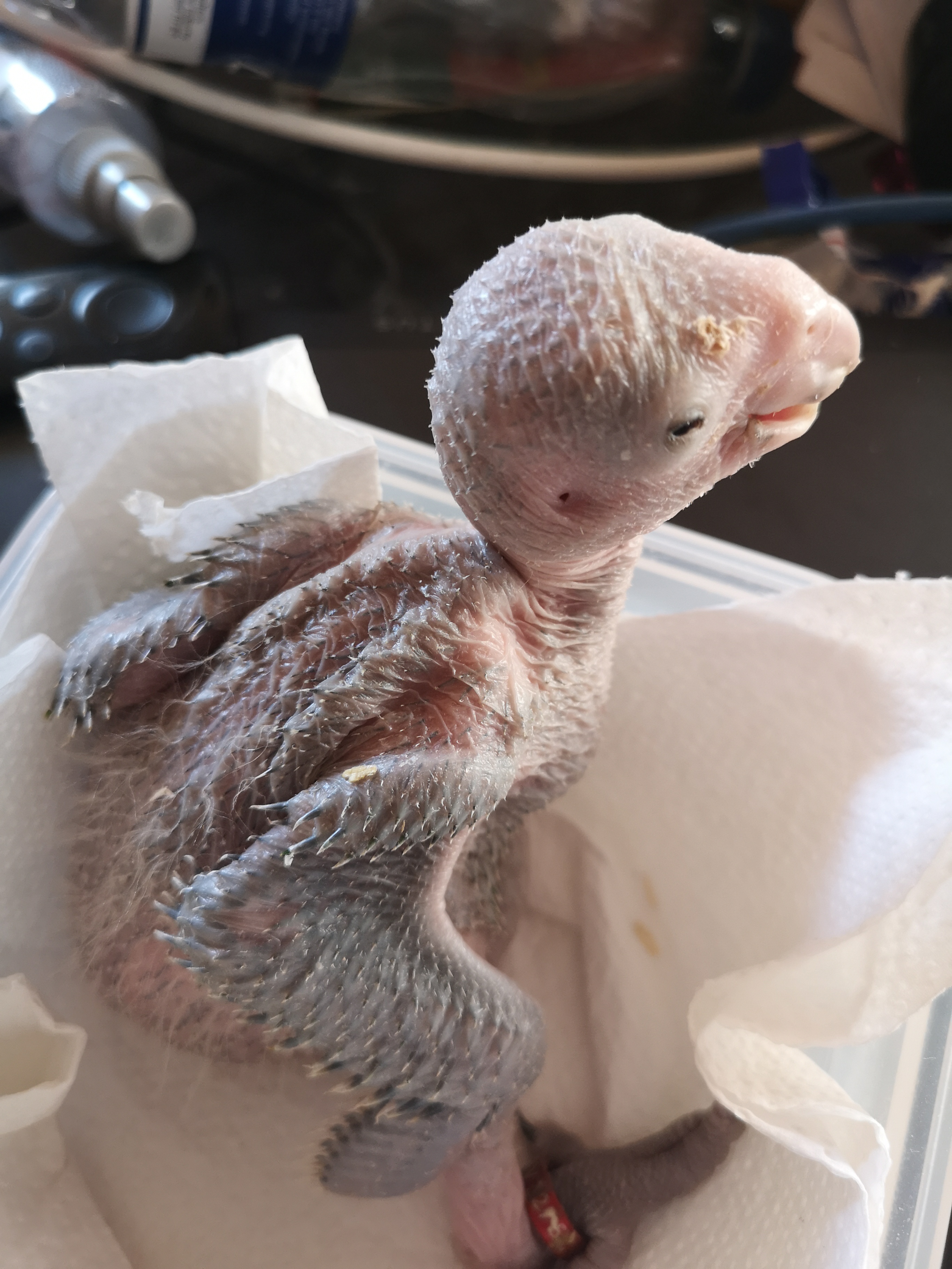 Det er en unge af Gulkindet amazone papegøje, 9 dage gammel.