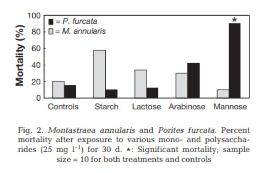 Løvfald, træer/grene og algers nedbrydning. Det er det der er en del af det naturlige koralmiljø. Der er ikke et vognlæs kartofler eller poser af sukker der bliver hældt i. I stedet er der en konstant nedbrydning af fiberholdige carbonmaterialer.