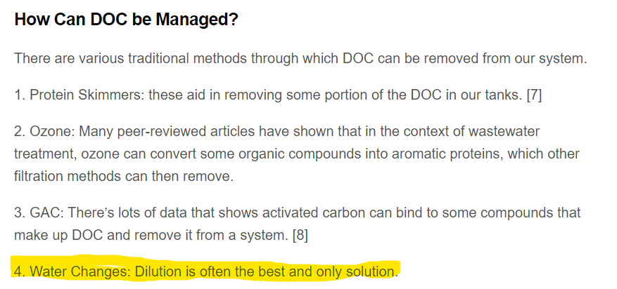 Det lader til at den eneste virkelig effektive metode til at holde DOC værdierne nede, er svampe og faktisk anbefaler han et godt gammmeldags biofilter med levende sten og svampe...