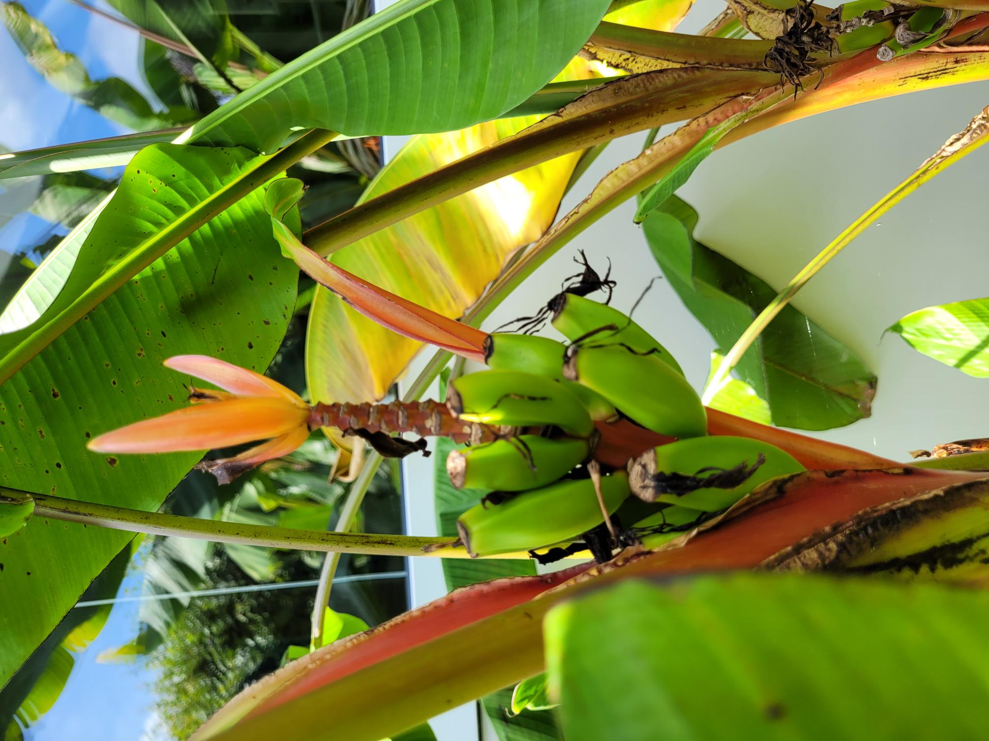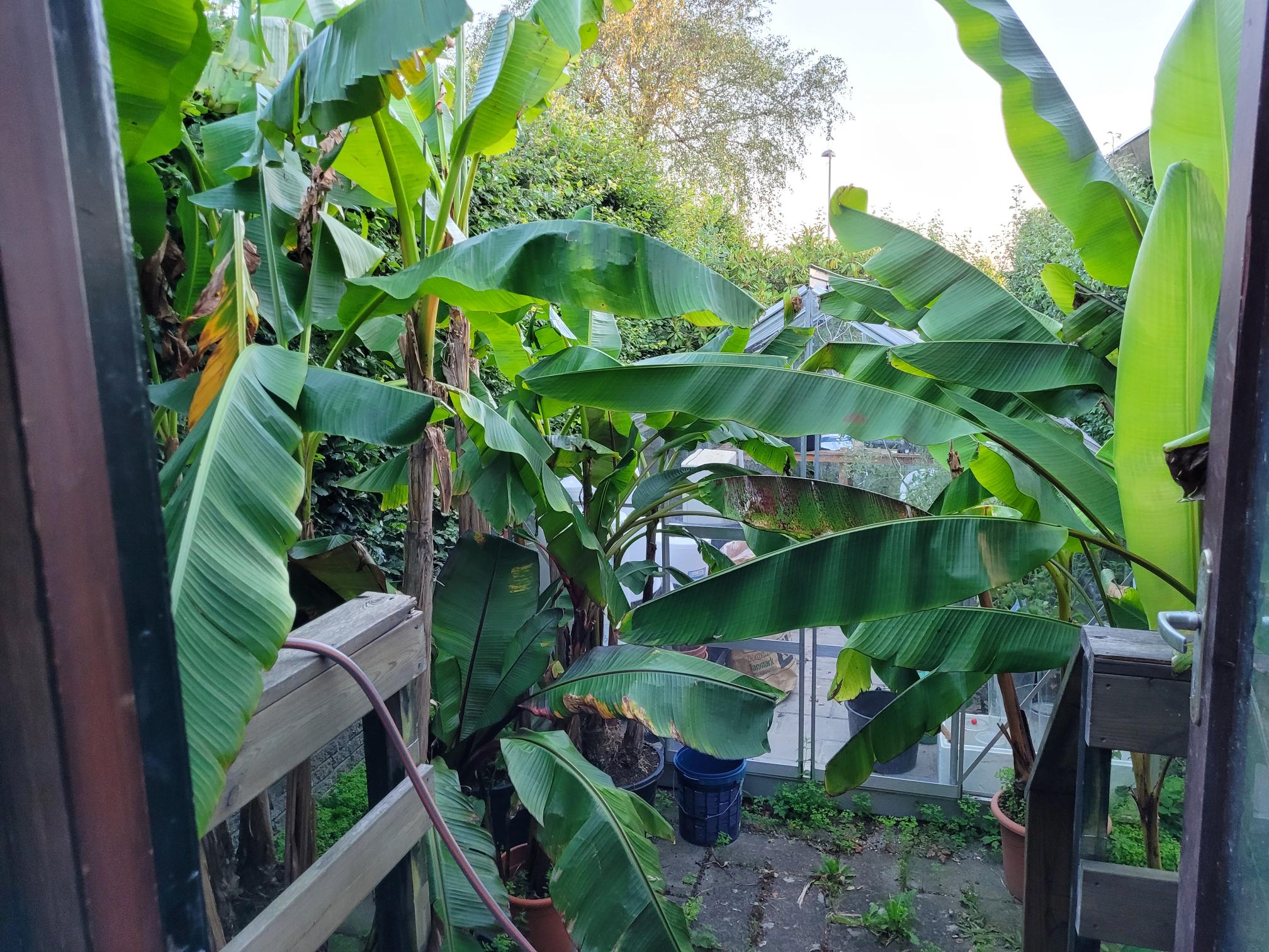Den ene af bananerne har blomstret flittigt i år. Det er en Musa laterita der er en ikke så tit set bananplante.