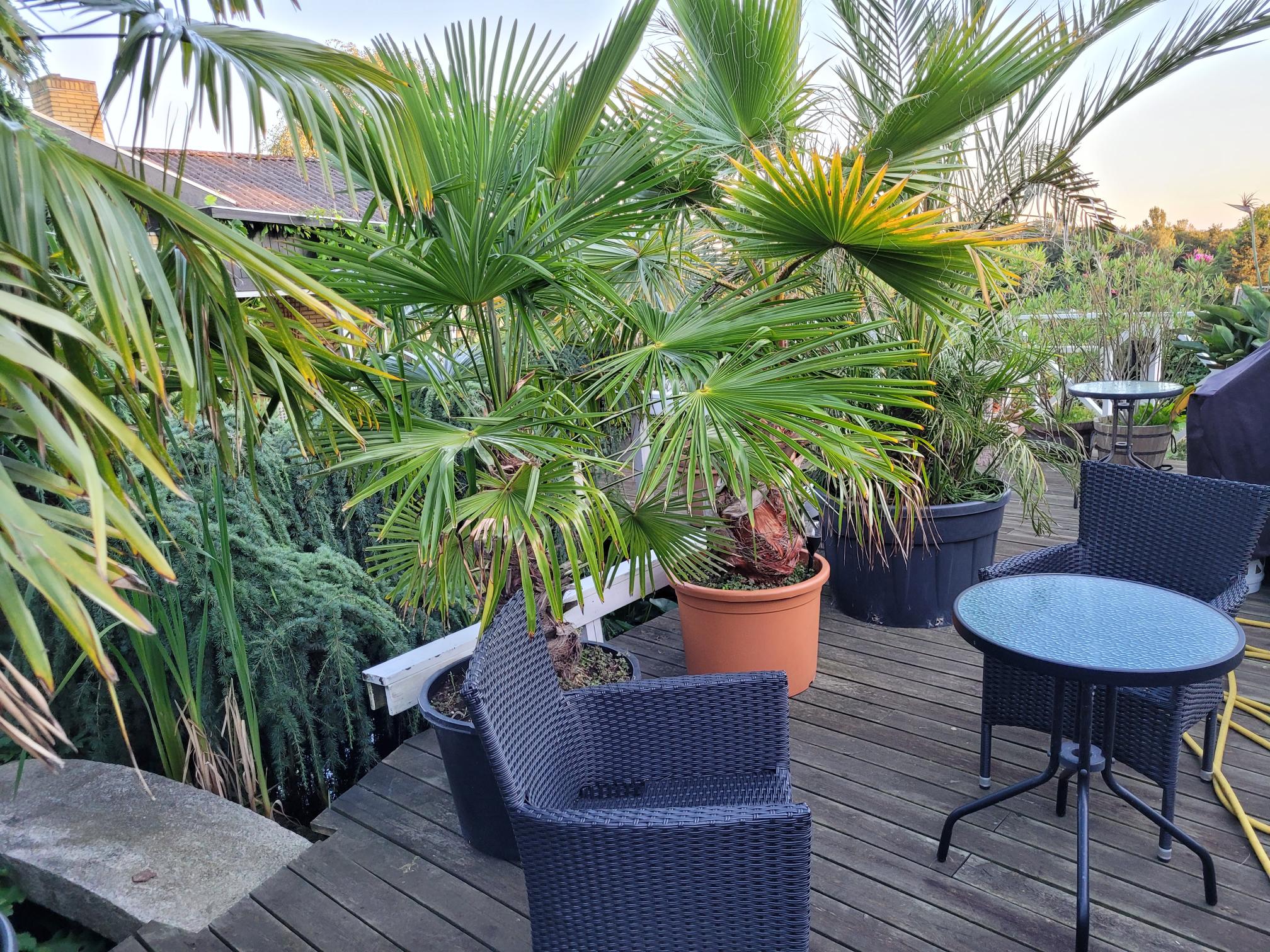 Jeg har mine største palmer på græsplænen, hvor de får lys og luft omkring sig. Det er Canarisk viftepalme og to palmer (Jubaea chilensis, der som navnet angiver stammer fra Chile