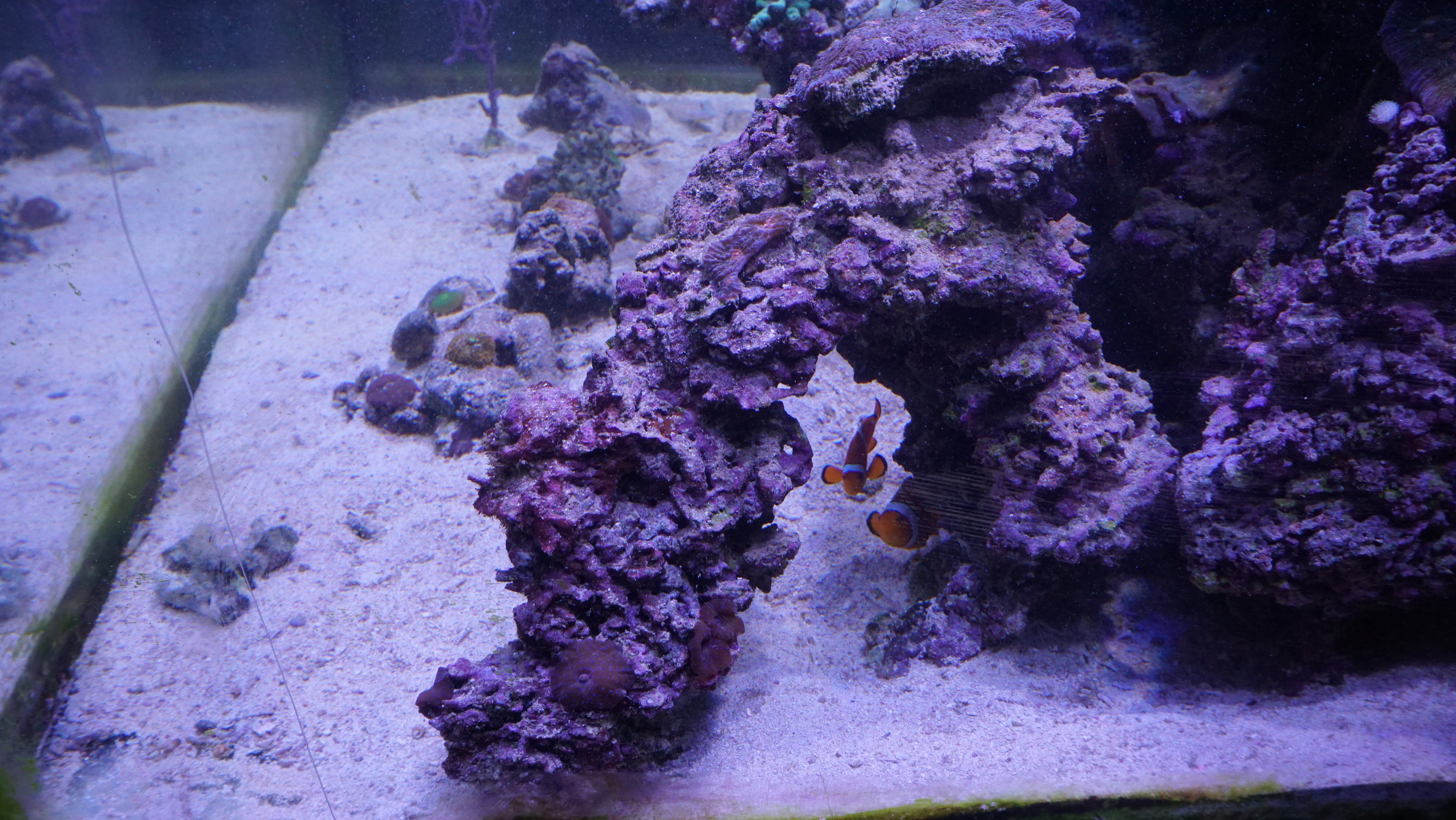 Bueformet dekoration / LS af sponge rock (mange mikroskopisk små gange og huller med stor bakterieflora). Der er lidt discosoma og måske også lidt småstykker af andre koraller på den. Den er ca. 25 cm høj og ca. 40 cm lang og ca. 15 cm i bredden (der hvor den er bredest). Flere huller som fisk kan svømme igennem. kr. 200,-