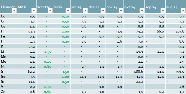 - Individuelle sporstoffer (f.eks. jod, brom, bor)