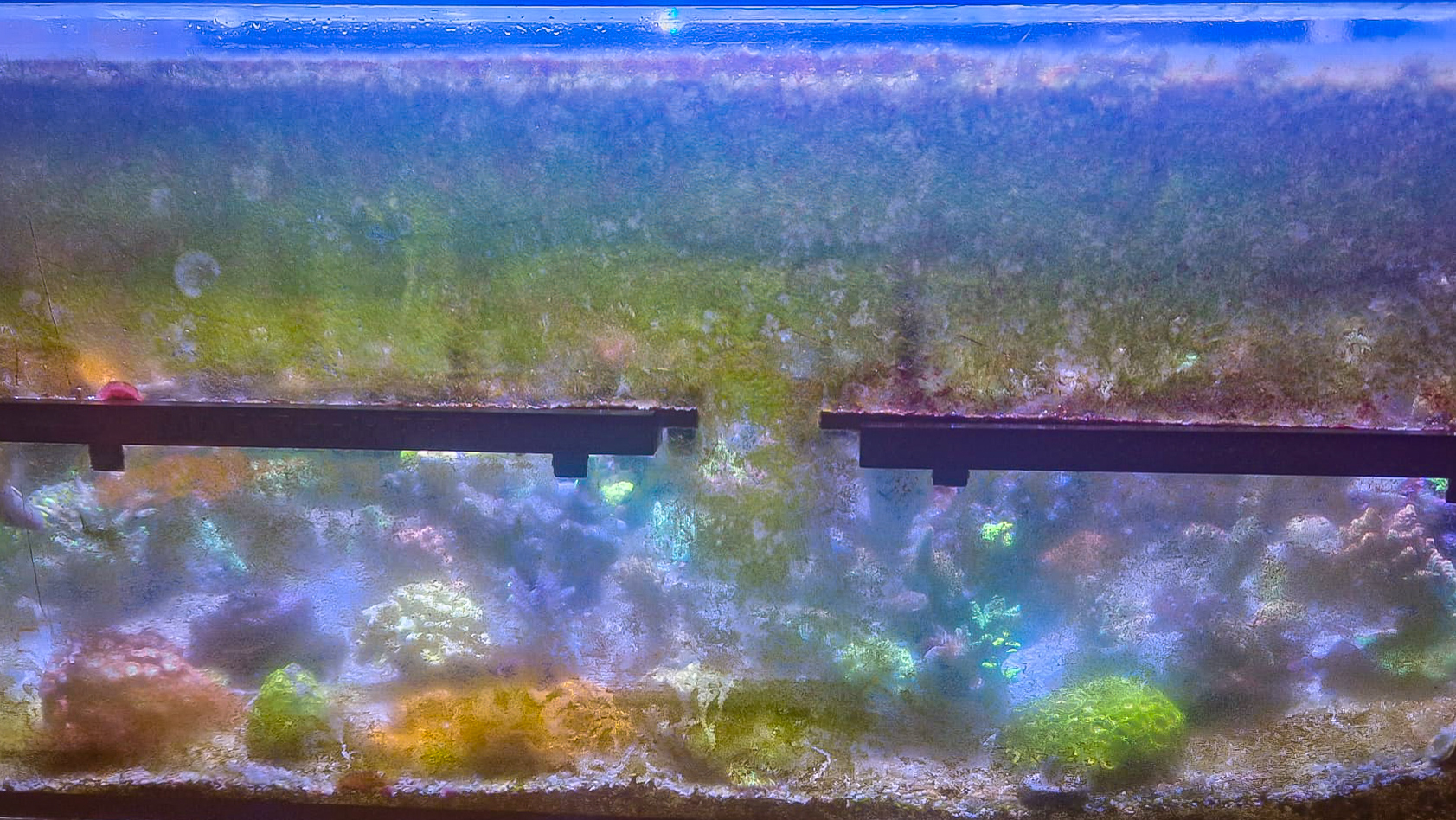 Kort opdatering: Som beskrevet kunne man se en brunlig belægning på bunden, som ikke lignede de Ostreopsis-dinoflagellater, jeg tidligere har haft problemer med. Det viser sig at være Coolia, som tilhører samme familie og behandles på samme måde som Ostreopsis. Heldigvis findes de kun i bundgruset og kan nemt pustes op i vandsøjlen, så UV kan eliminere dem.