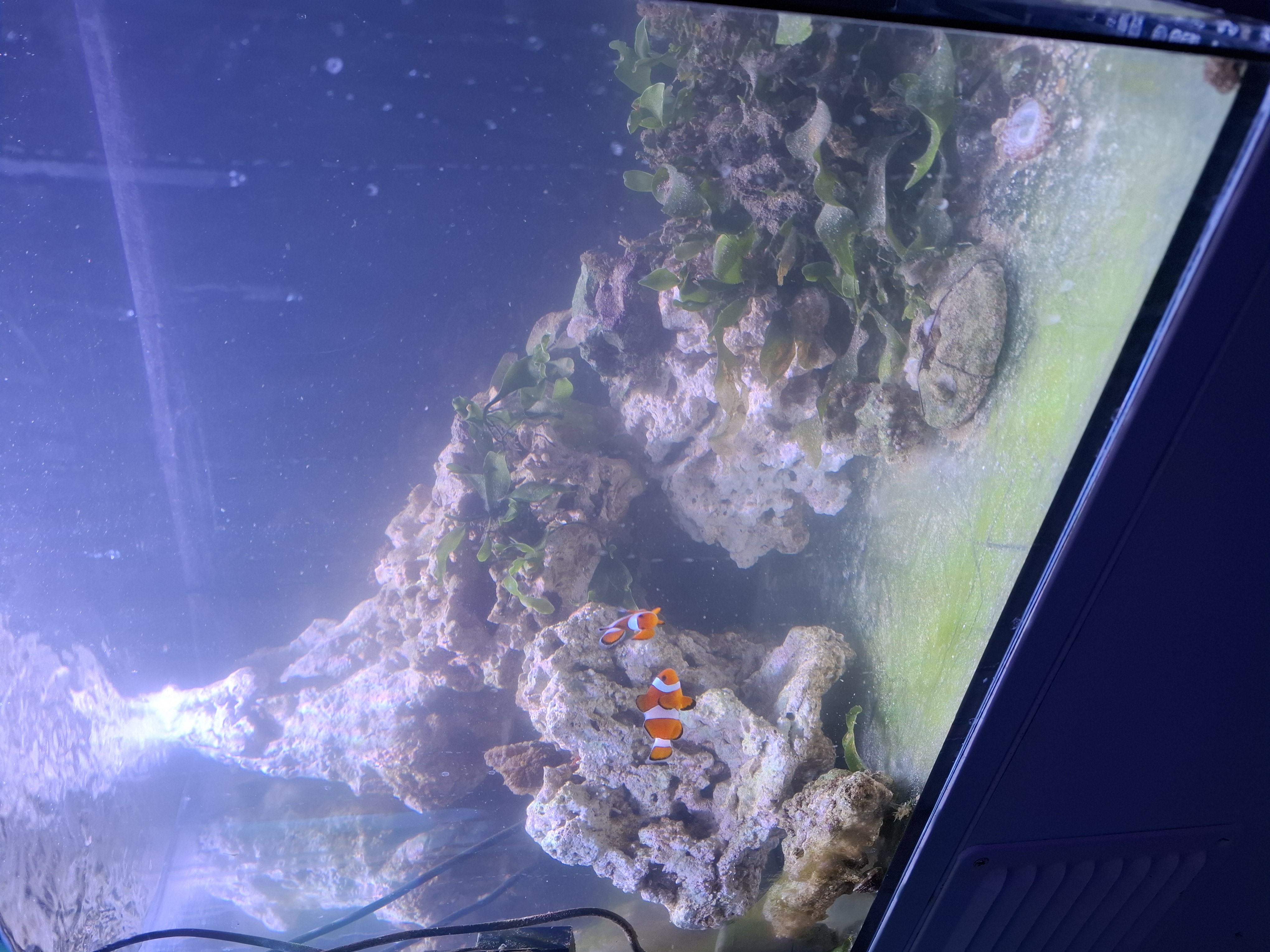 Fisk bliver 2 klovnfisk fra det store akvarium, måske en yellow watchman gooby og pistolreje. Men det kræver sand, som jeg ikke planerer at have.