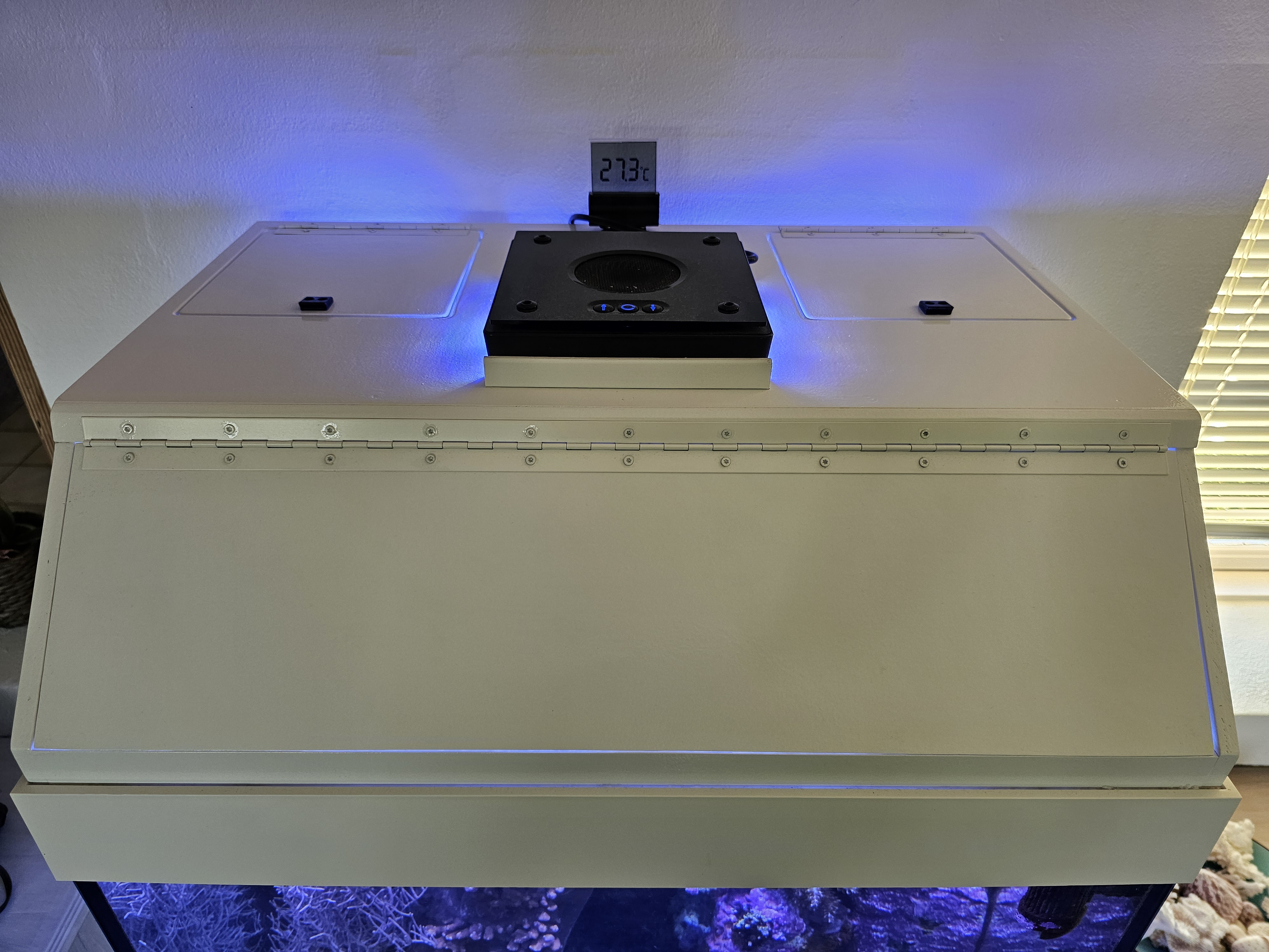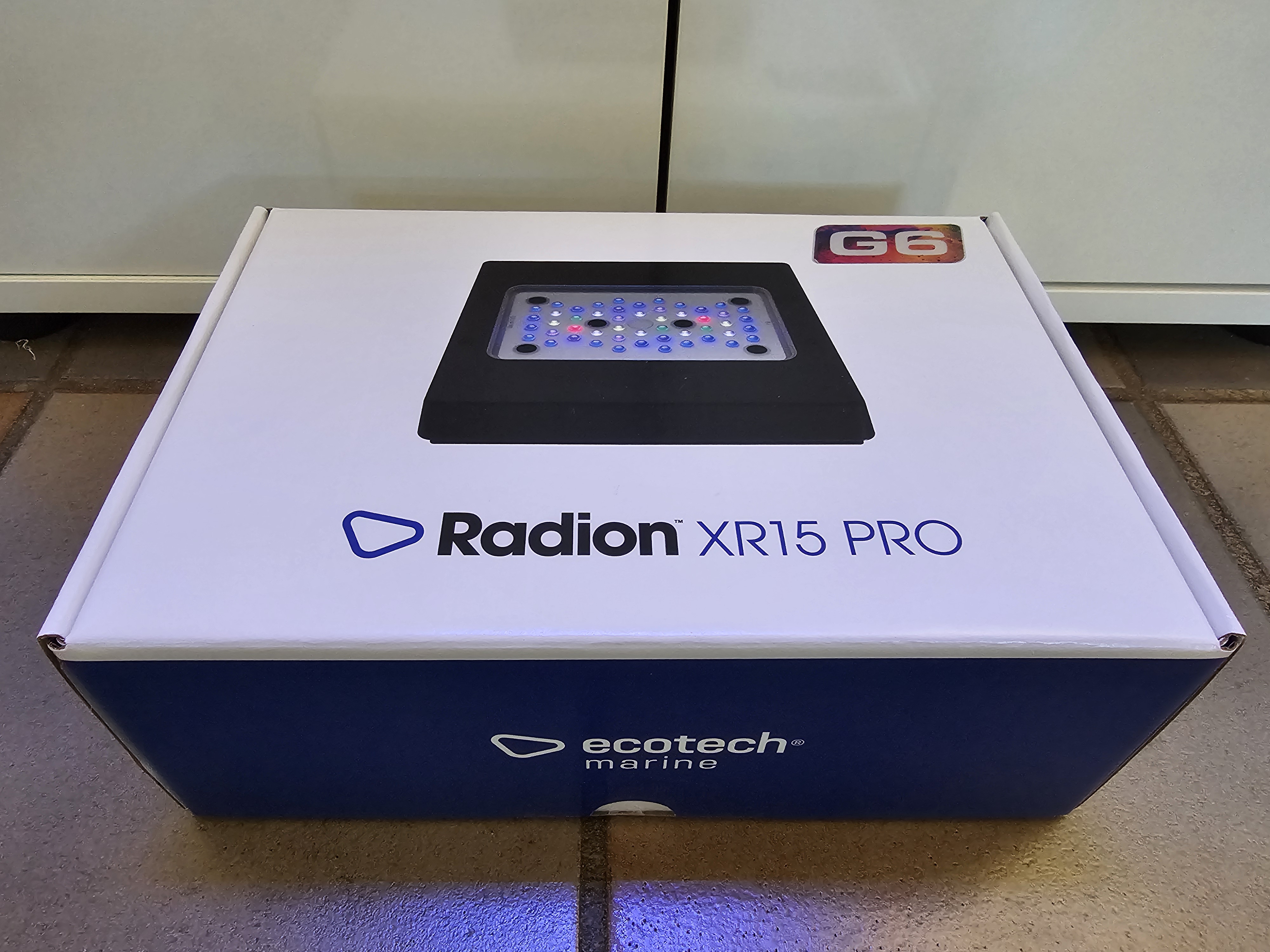 Radion XR15 PRO G6 fra 2024 (nypris 4000 kr) + Tunze LED full spectrum 8850 i hvid lampekasse med 2 blæsere for ventilation.