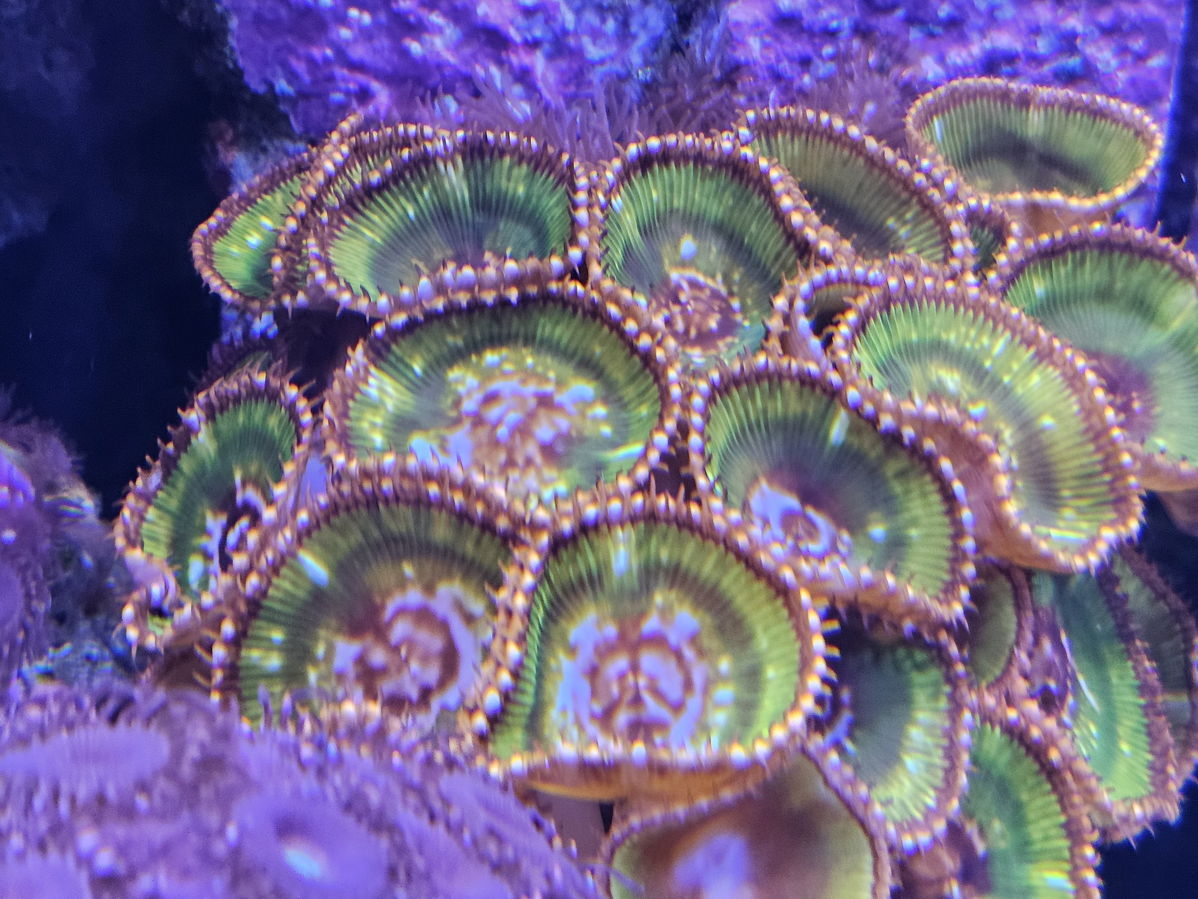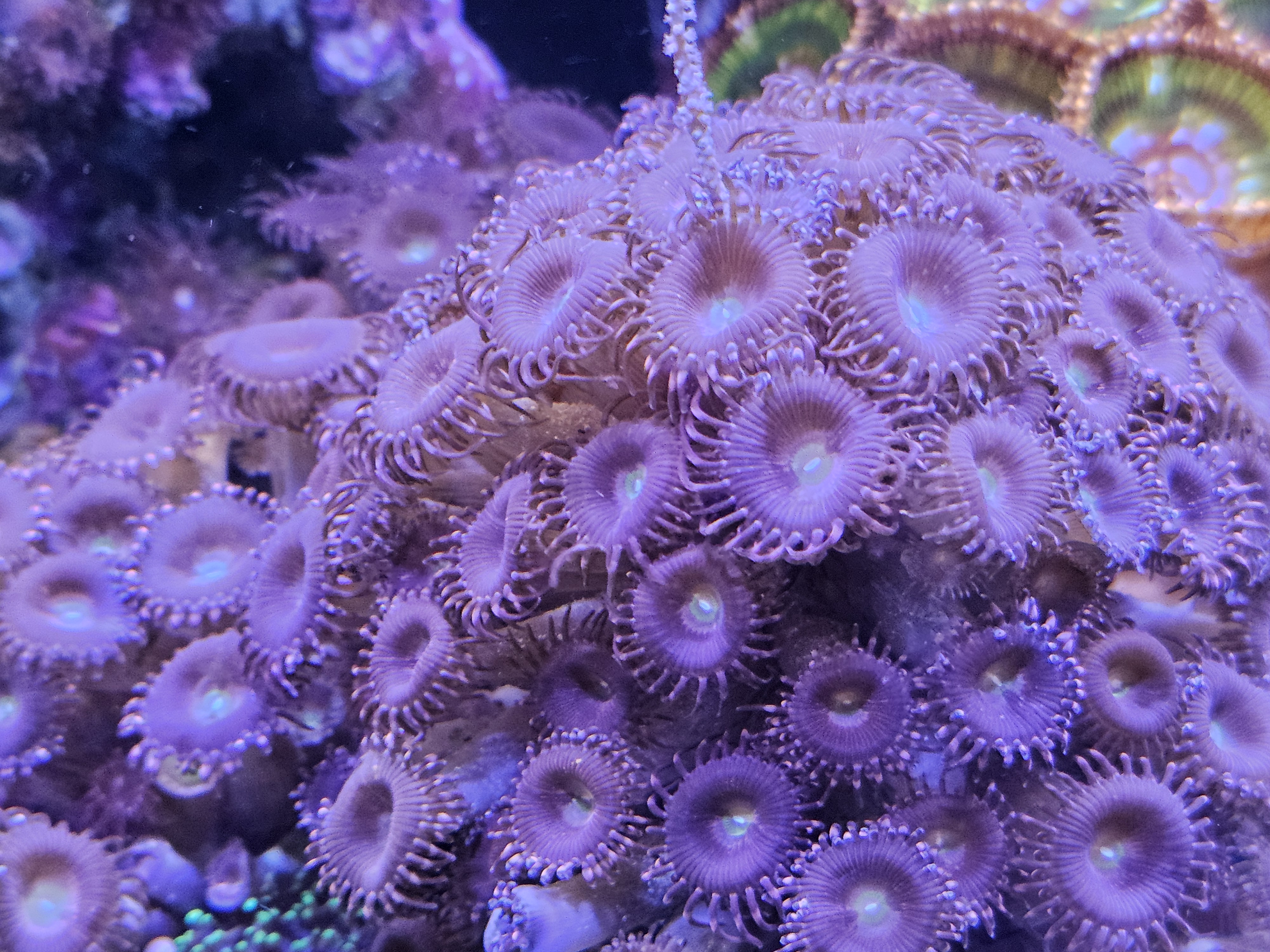 Koraller: Hammerkoral med mange hoveder, stor Porites stenkoral, meget grønne rhodactis skiver, stor lilla gorgonia, grønne zooa, lilla-brune knap-polypper, Kenya-træ mm.