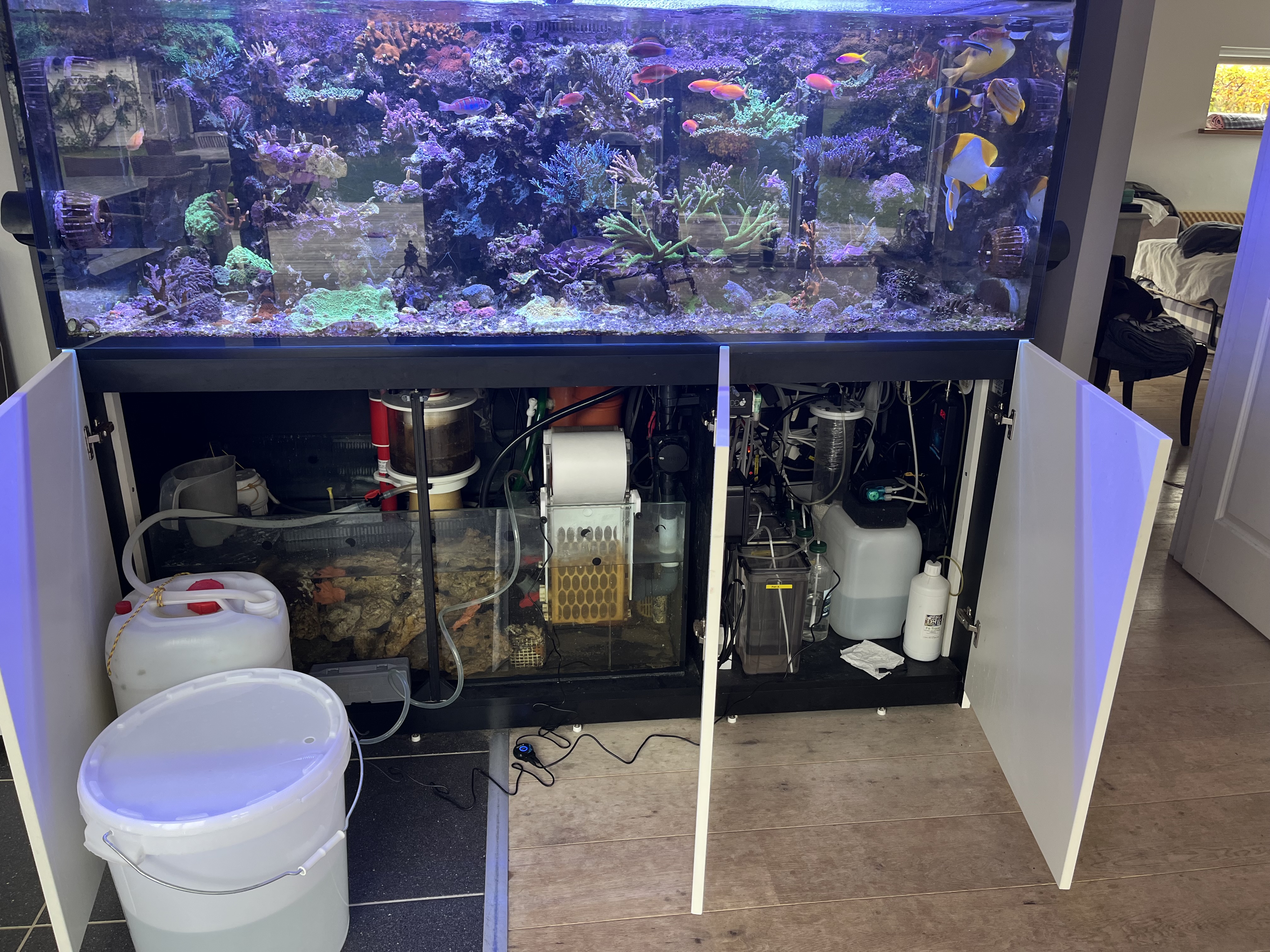 Tidligere plejede jeg at forberede 95 liter vand i en tønde i badeværelset dagen før (det tager tid at lave, blande og få den rette temperatur på vandet) → slukke alt undtagen lys og cirkulation → tømme sumpen med en pumpe og en lang slange → pumpe det forberedte saltvand over i sumpen, og tænde for alt igen. (Mit 700-liters akvarium står 15 meter fra badeværelset...)