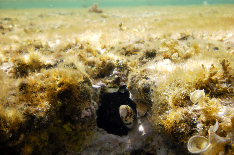 Her er vandet så lavt at kirurgfiskene ikke kan komme og æde, så der er masser af bunlige slimede alger.