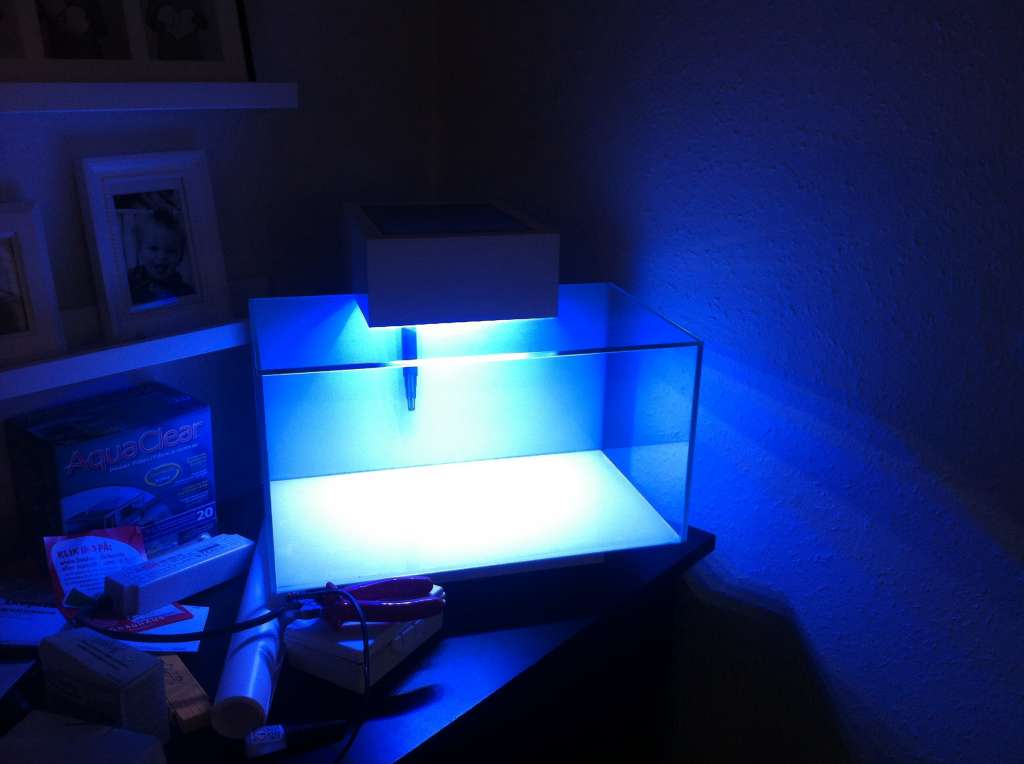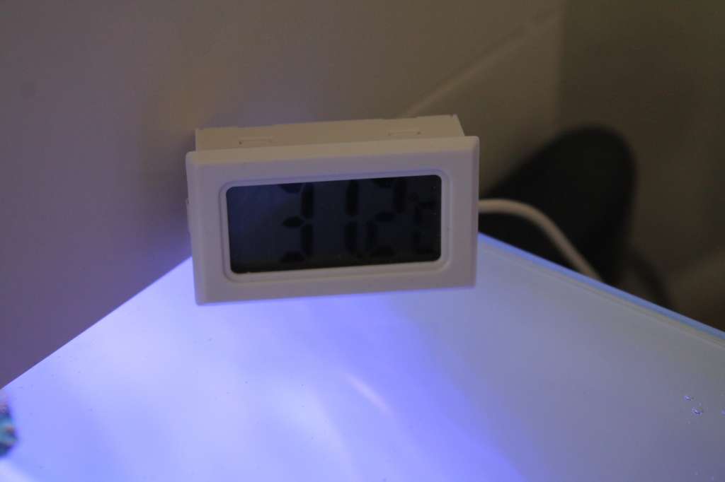 Mangler lige temperaturmåler til vandet også. Den viste måler lampens temperatur. Begge displays skal integreres i akvariets fod, så man nemt kan se dem.