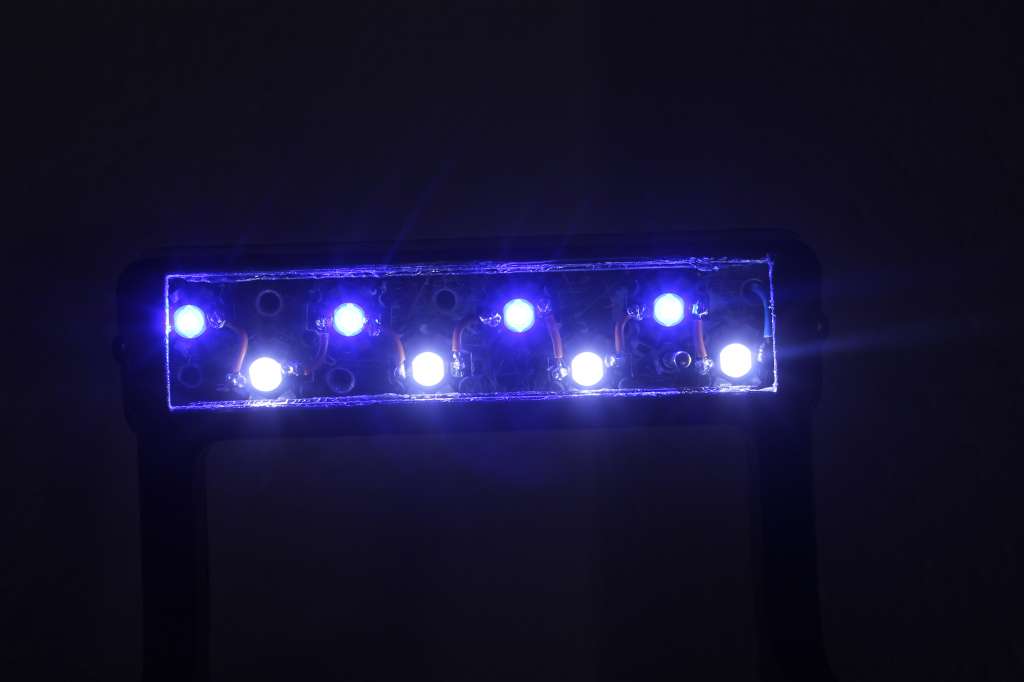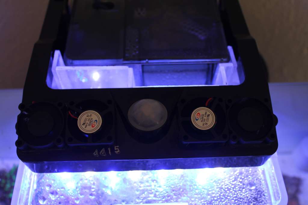 Ja det er blevet rigtig godt. Har bestilt to ekstra blæsere, så jeg kører med fire og ikke kun to. Har lavet huller til dem på toppen af lampen, så de er lige til at tilføje når de kommer med posten. Indtil da kører jeg med lyset godt skruet ned, så det ikke bliver for varmt. Har mærket på dioderne i dag og de er ikke engang lune. Jeg har derfor ingen bekymringer ved at skrue op for styrken når der er fire blæsere på. Det eneste, som afslører at jeg har ændret på lampen er blæserne, hvilket er ret fedt. En fordel ved at vente med at skrue op er også at korallerne kan vænne sig til styrken.