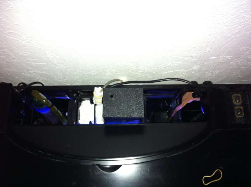 Den bagerste ”flap op låge”, som giver adgang til skummer osv., er taget af. Dermed er akvariet ikke så ”lukket”, og det giver mulighed for at placere en blæser, der kan blæse henover vandets overflade, hvis temperaturen bliver for høj.