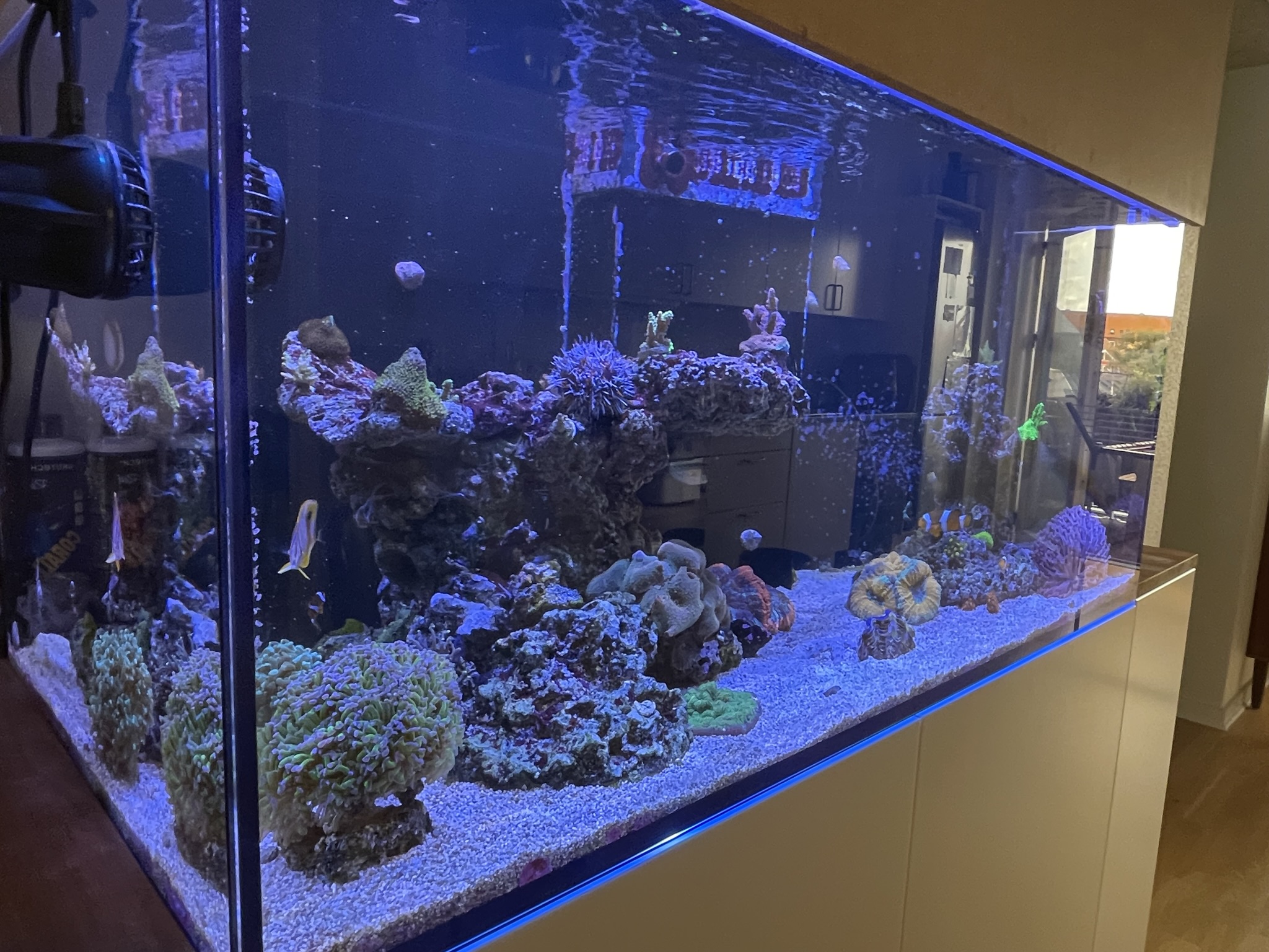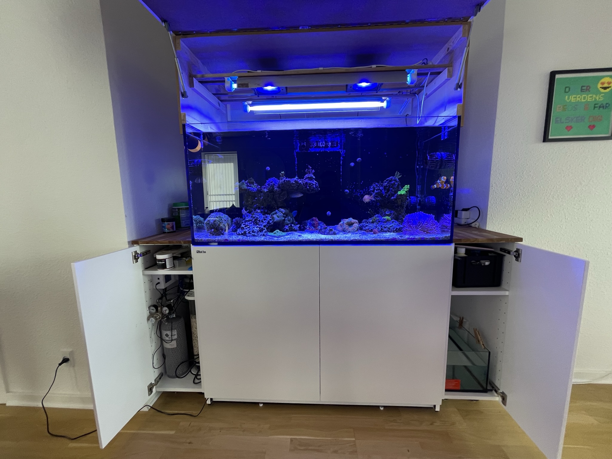 Red Sea Reefer 425XL. Tilstødende IKEA skabe også har jeg lige bygget mig en top som skal males i samme farve som akvariet, hvis