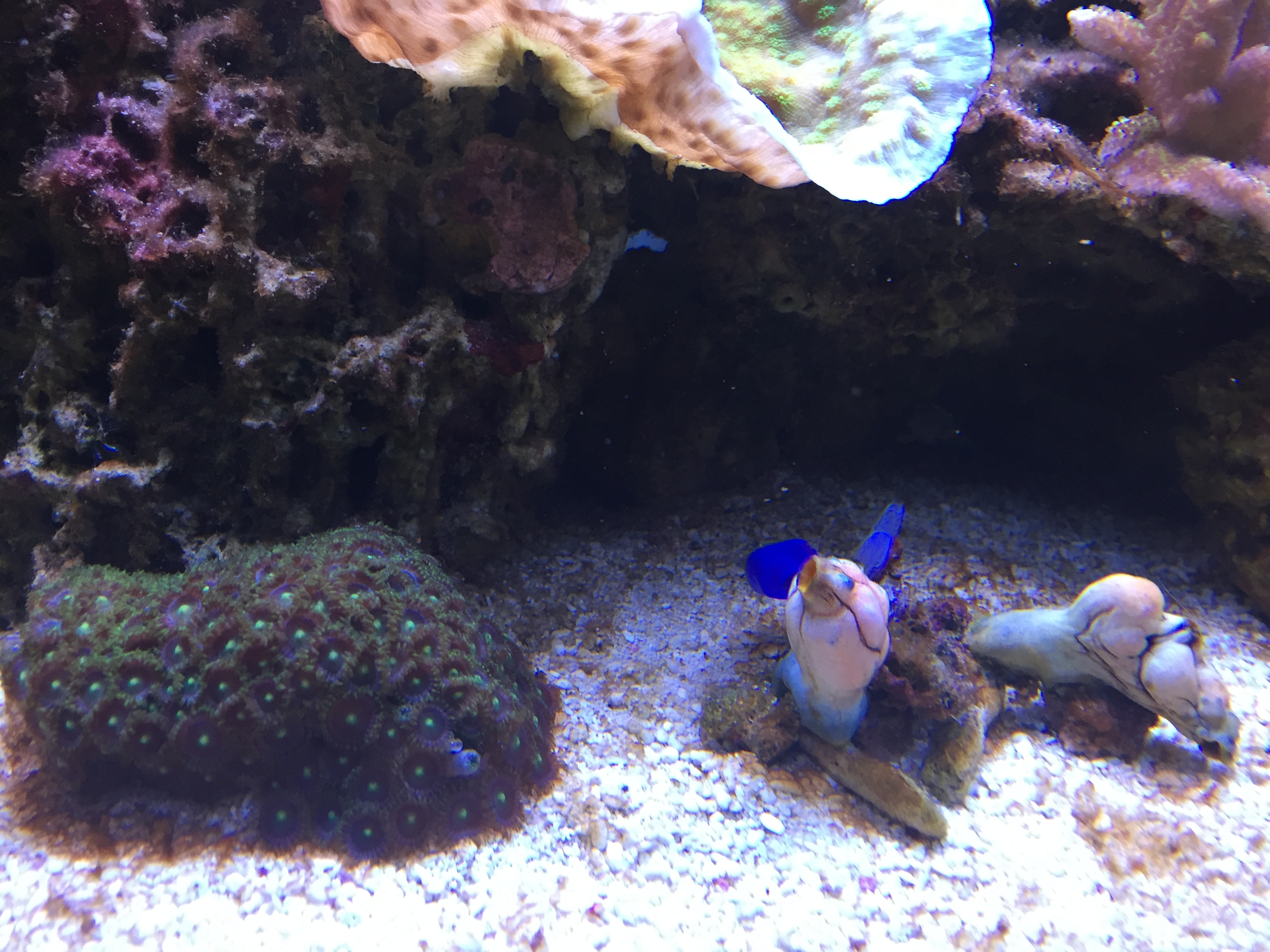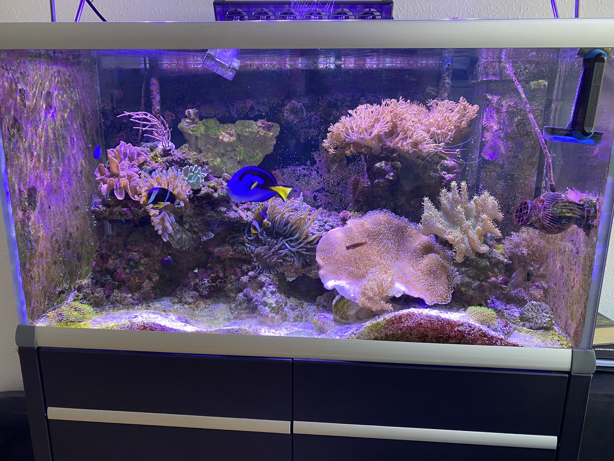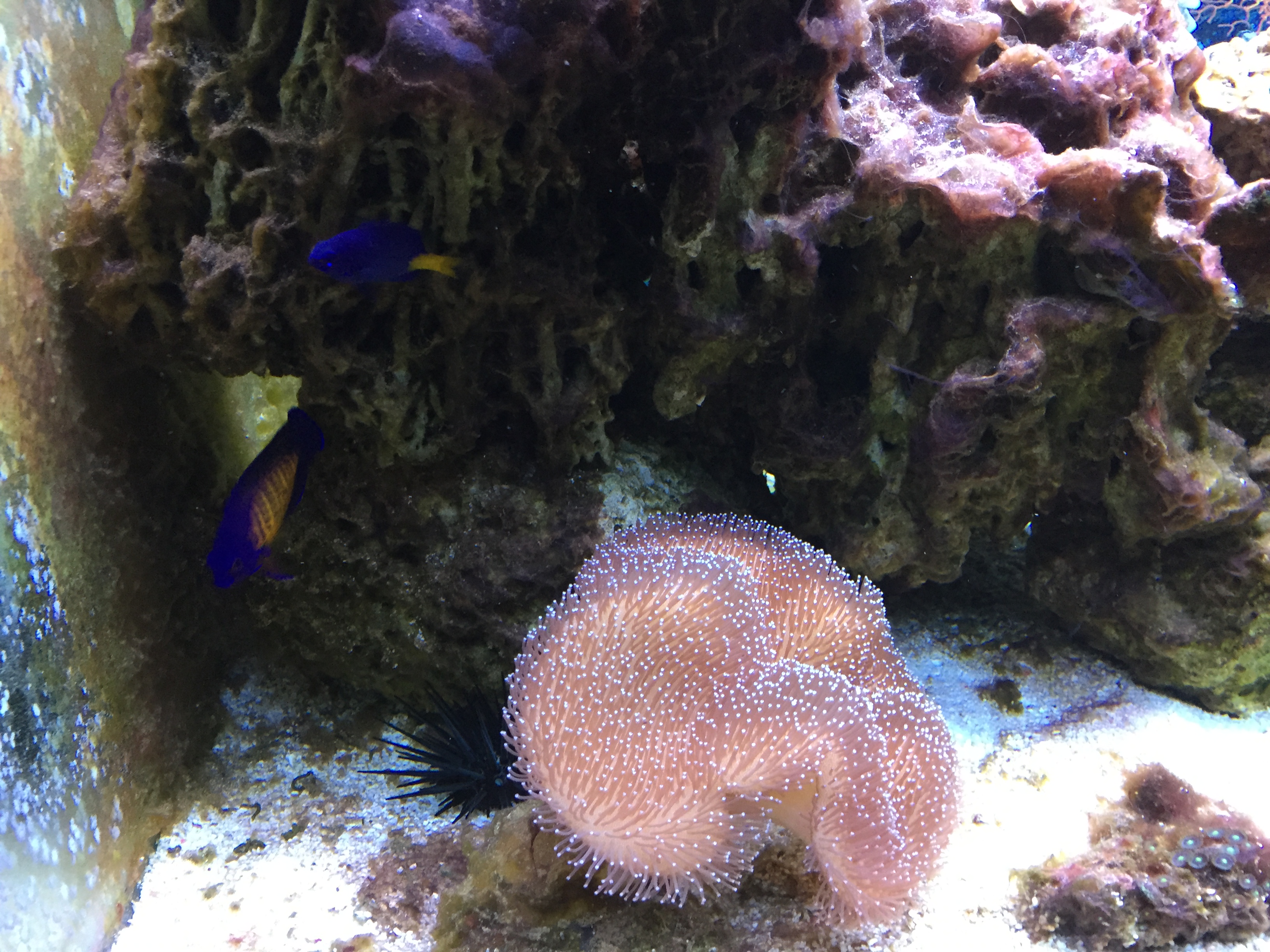 Det største problem nu er at vi har 2 BTA, som ikke kan fjernes uden at hele stensætningen skal op. Købte en som selvfølgelig ville sætte sig fast under en sten/hule – efterfølgende har den delt sig, og begge disse BTA optager 1/3 af akvariet, og selvfølgelig i midten. Hvilket gør at det er svært at få plads til koraller som ikke vil blive generet af BTA. Mens dette skriv blev til har den delt sig så jeg havde 3, og har fået fanget de 2 op. Så nu er der kun en som fylder midten af akvariet.