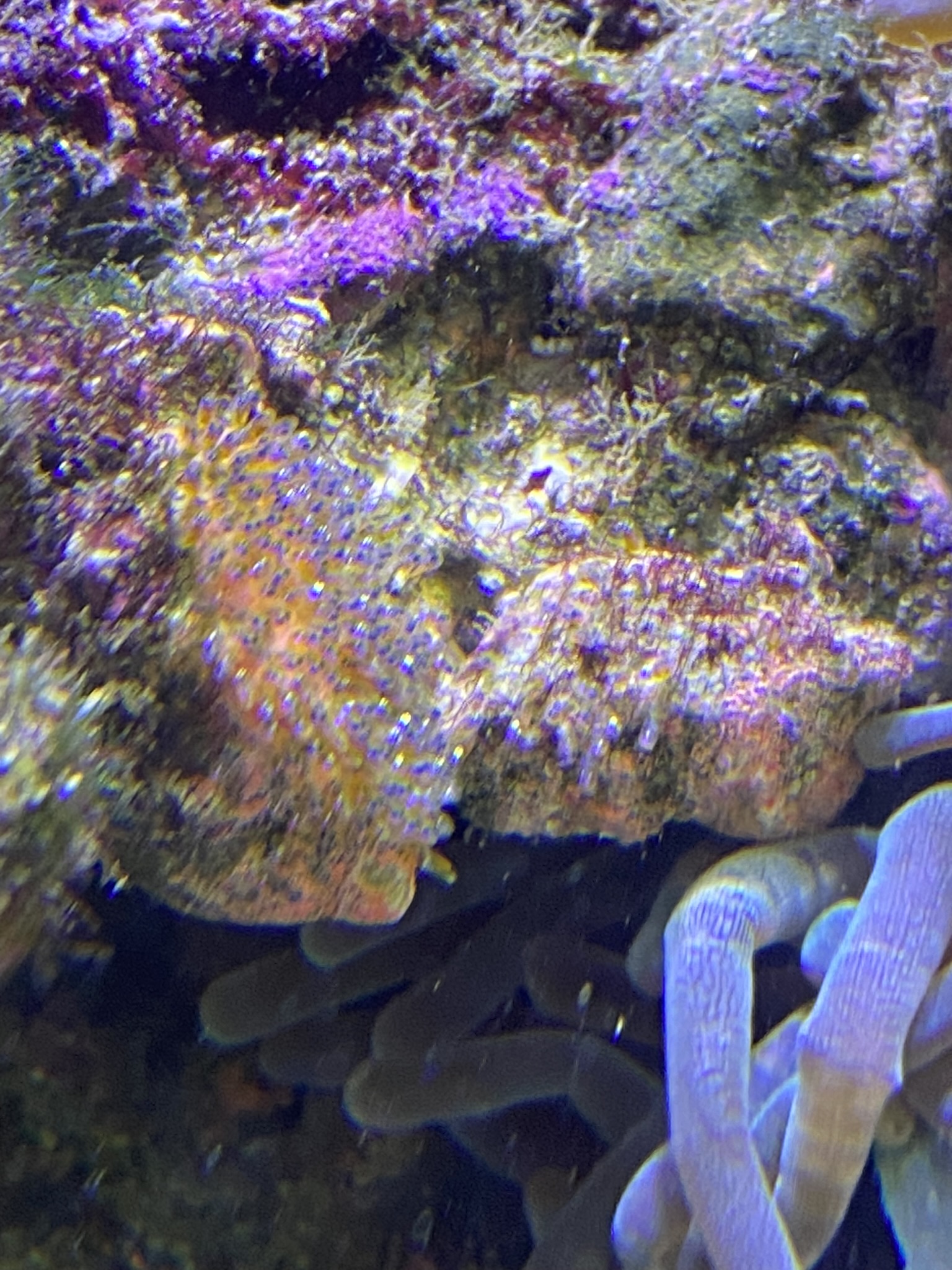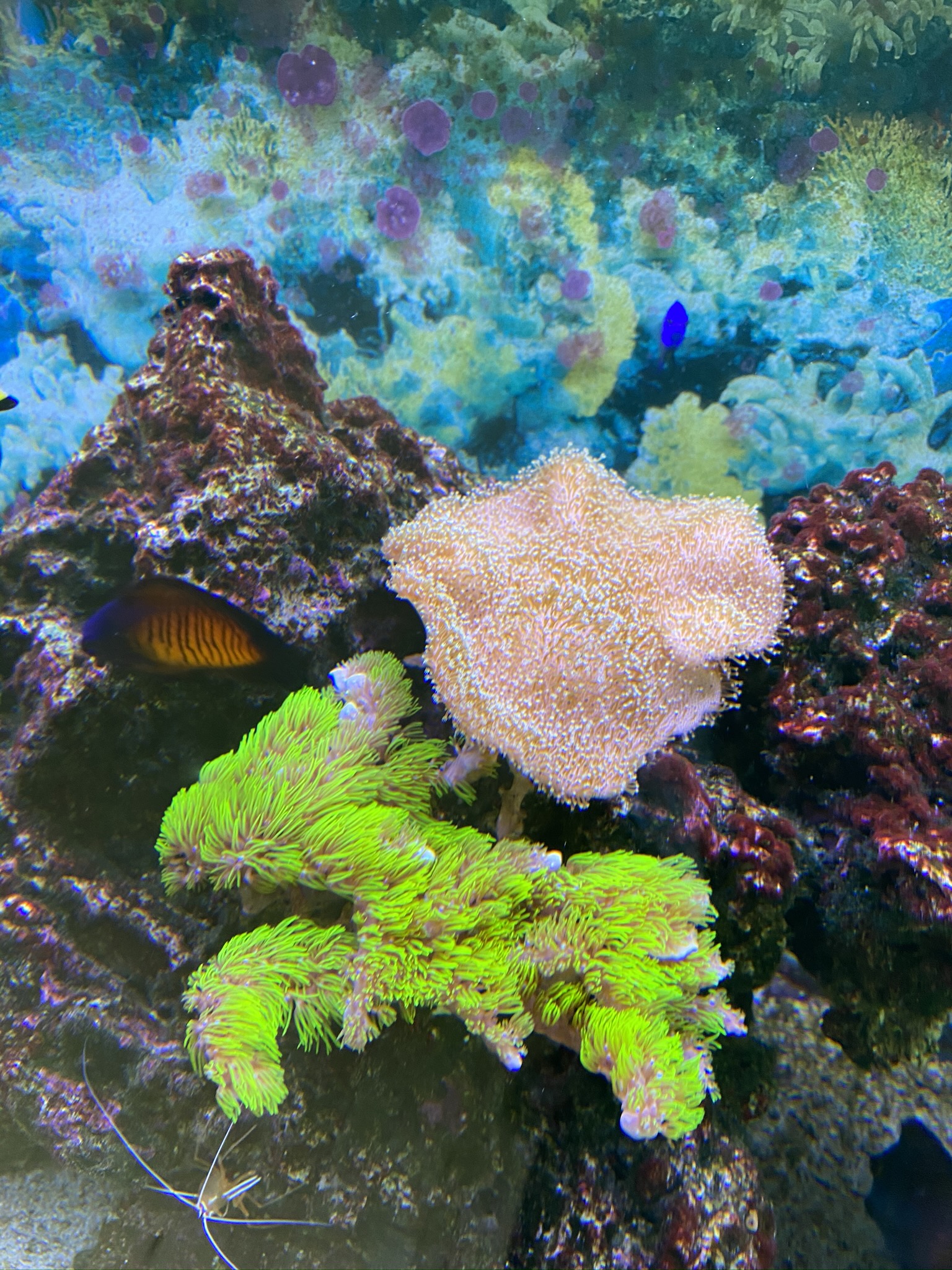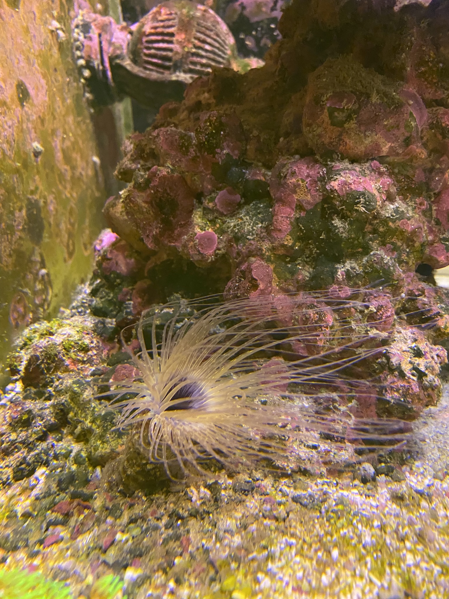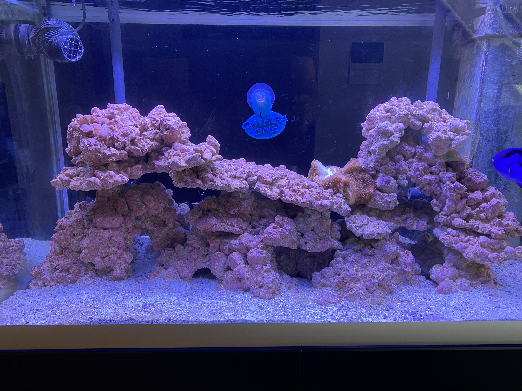 Det største problem nu er at vi har 2 BTA, som ikke kan fjernes uden at hele stensætningen skal op. Købte en som selvfølgelig ville sætte sig fast under en sten/hule – efterfølgende har den delt sig, og begge disse BTA optager 1/3 af akvariet, og selvfølgelig i midten. Hvilket gør at det er svært at få plads til koraller som ikke vil blive generet af BTA. Mens dette skriv blev til har den delt sig så jeg havde 3, og har fået fanget de 2 op. Så nu er der kun en som fylder midten af akvariet.