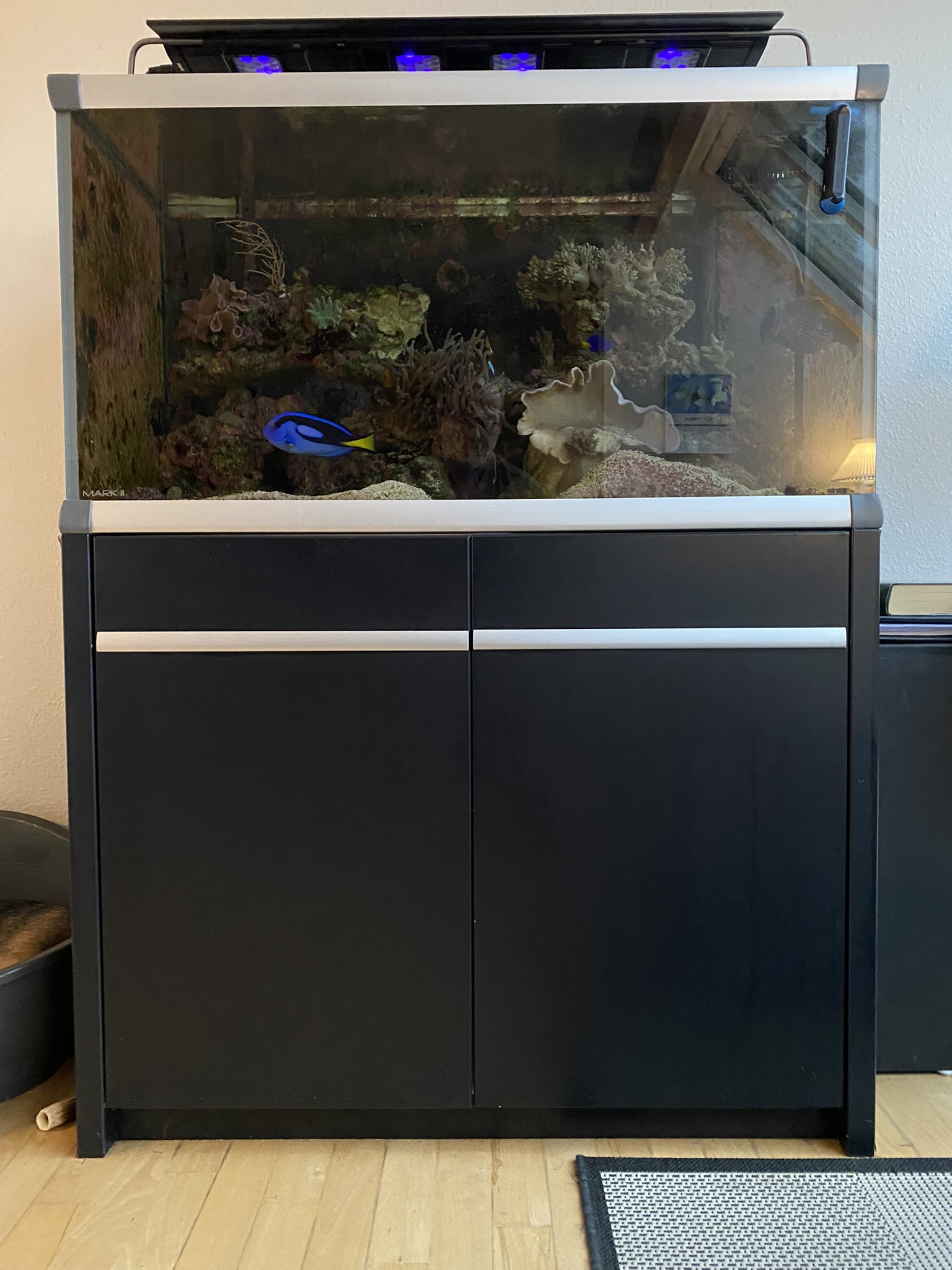 Dog hjælper hun med kontrol af vandværdier, er nemlig lidt rød/grøn farvebind (her bruger jeg en app. til iPhone Color Blind Pal, den virker) samt har været med til Aquascaping. 4 øjne ser bedre end 2, været med til at bestemme fisk / koraller. Men bliver som alle andre ked af det når ens yndlingsfisk forsvinder/dør.