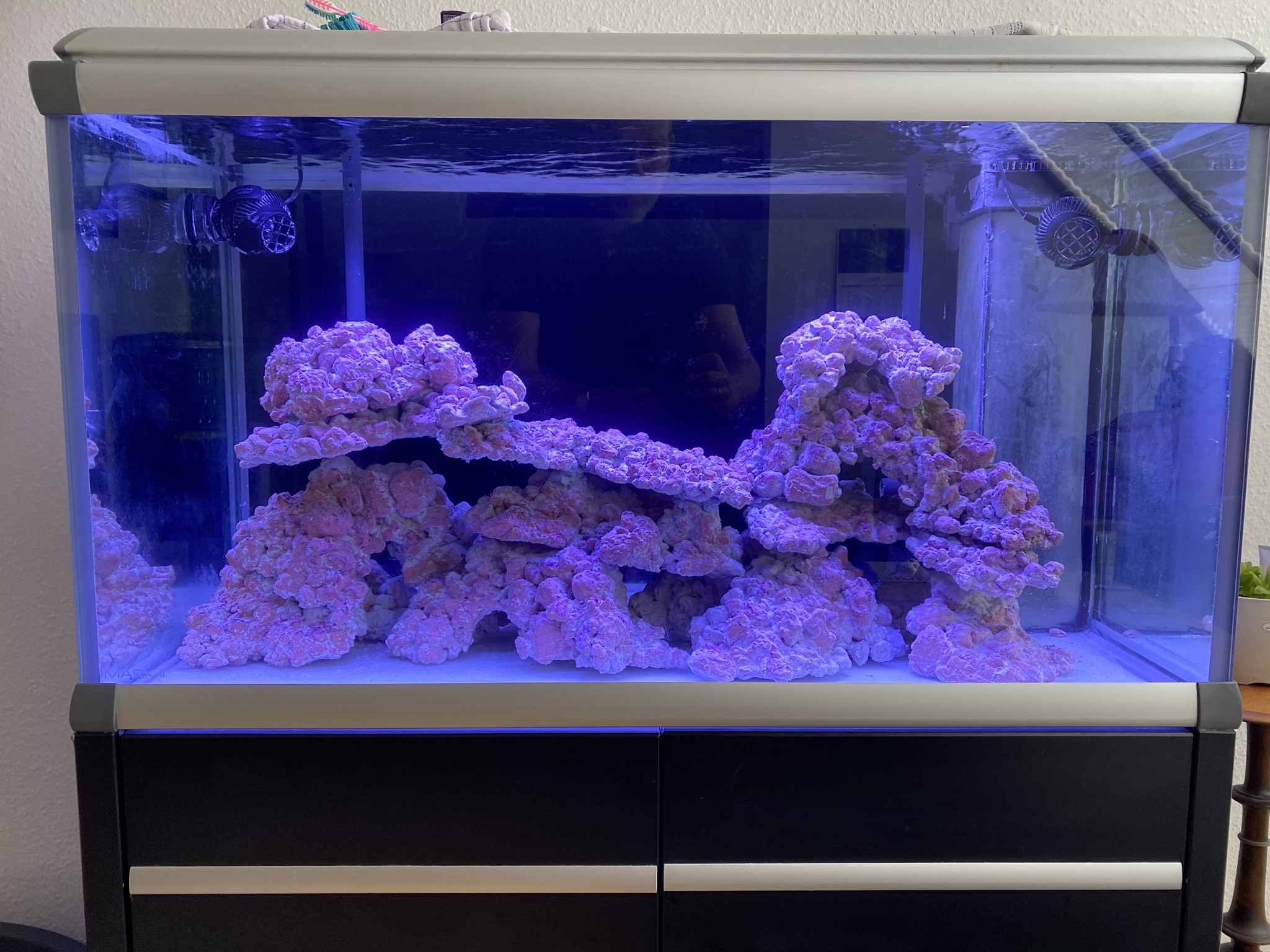 Så skulle akvariet tømmes. Ny rørføring skulle der laves, da der nu skulle UV lys på samtidig blev der tilføjet en algereaktor. Ny aquascaping, da jeg valgte at kasserer de gamle indkørte sten. Der blev indkøbt AF Rock.
