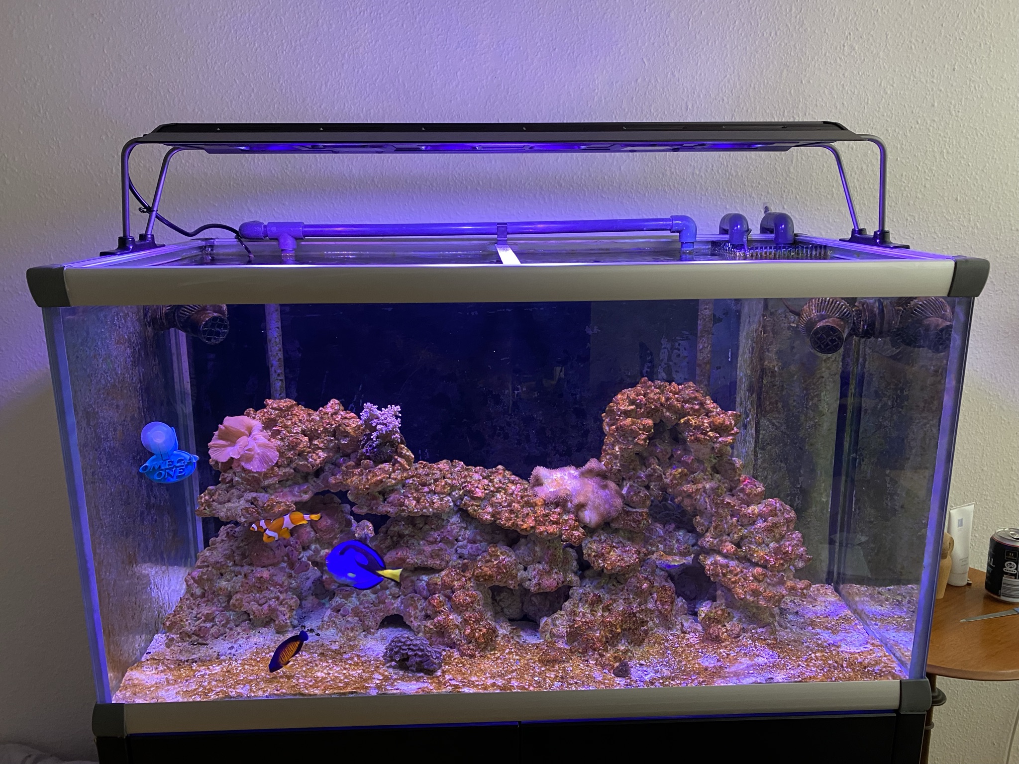 Ville først starte op uden sump, derfor blev der købt en Deltec MCE600 skummer, men den ide blev skrinlagt, så der skulle findes på at lave overløbskammer, samt havde ikke mod på at bore hul i bunden, for at få rørføring til sum. Søgte på nettet, og fandt en video på youtube med DIY Aquarium overflod PVC. Har kørt med det siden 2015, uden problemer. I selve akvariet fik jeg bygget overløbskammer, samtidig have jeg et lille 54l, som blev lavet om til sump med boblefælde. Levende sten blev hentet hos Klovnfisken på Amager. Vores første fisk var Ocellaris klovnfisk, sammen med en anemone. Hunnen blev syg, og herefter spist af anemonen. Det var lidt barsk at se, at der hang en død fisk ud af anemonens mund. Fik en ny Ocellaris og her opdagede jeg, hvordan de kan skifter køn. Havde det par indtil i foråret 2023, hvor jeg troede, at man kunne have 2 par i samme akvarie. Blev frarådet det her på forrummet, men flere på Facebook mente, at det kunne man godt.