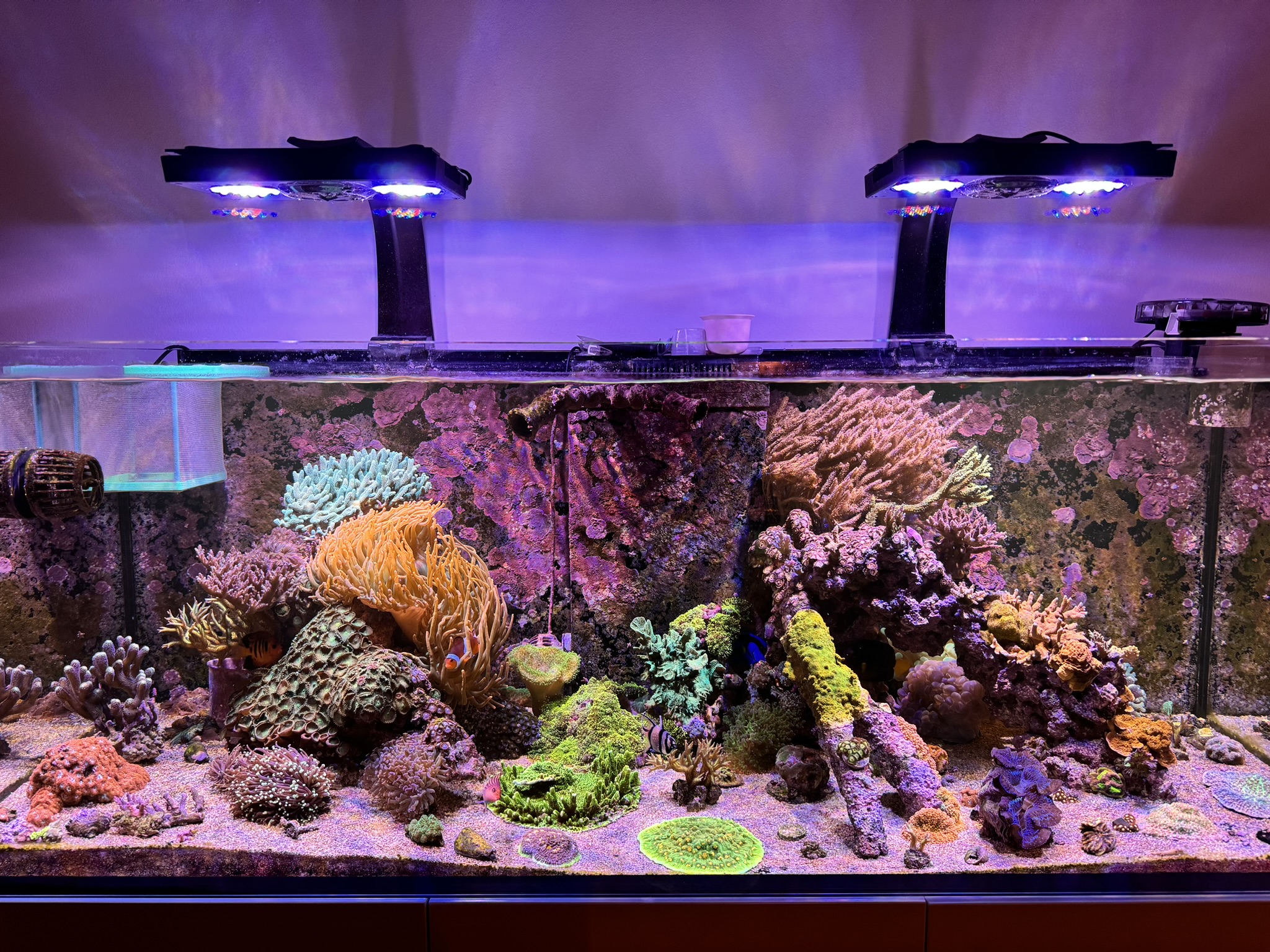 Jeg bruger 2 XR30 G4 pro fra Ecotech til displaytanken. Det er fede lamper med et hav af muligheder, og det bedste er, at de giver god spredning og masser af lys til revet. Programmet jeg kører, har taget udgangspunkt i Ecotechs Coral Lab SPS AB+ program.