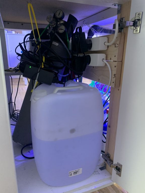 Sander Ozonisator C100 som giver krystal klart vand. Jeg justerer den manuelt op og ned. Overvejede at koble den på min Powerbar, og så styre den efter Redox-tallet. Men var ikke sikker på det gav mening. Så lige nu foregår det manuelt. Den er koblet til en CO² Scrubber for at sikre tør luft til ozionatoren (luften i skabet kan godt være fugtig).