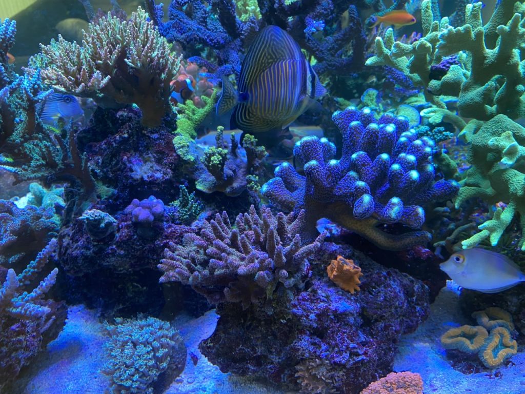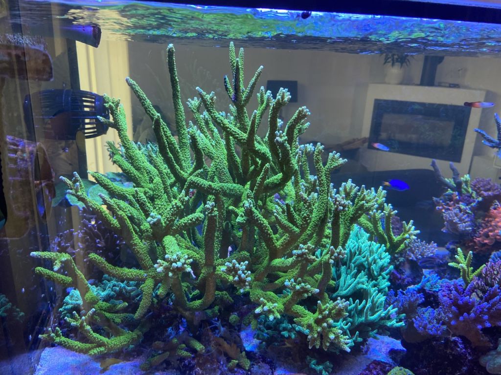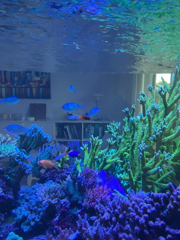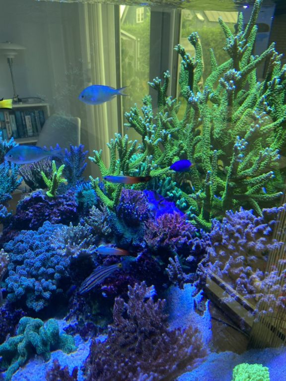 På nuværende tidspunkt er det lykkedes mig at få Sofie på 10 til at være nogenlunde interesseret i akvariet, ellers har ingen af de andre slyngler interesse for det. Jeg har haft saltvand on and off siden 2006, og var med dengang, der var noget der hed Nordic Reef forum. Mit nuværende systemet har kørt siden februar 2016, med løbende opgraderinger, og er med levende sten fra mit allerførste akvarium.
