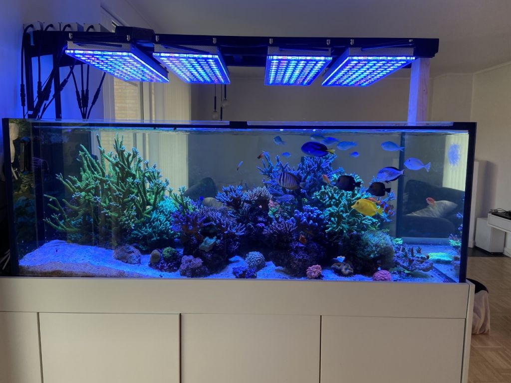 Har jeg haft meget forskelligt af :y Men nu har jeg fundet det lys, og de lamper jeg gerne vil have. Jeg har 4 stk. Orphek Atlantik V4 (gen 2). De er nemme og styre, og giver et rigtig fint lys. Så er det muligt at have dem over akvariet, uden at de blænder dem, der sidder i sofaen ved siden af akvariet. Parmåleren siger 800 par i toppen, 500-600 i midten og omkring 200 på bunden. Der hænger en No-name Kina-lampe over fragmentakvariet.