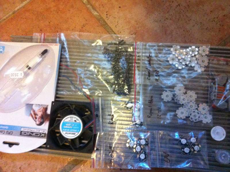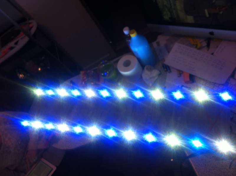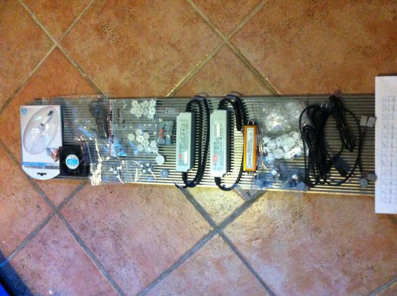køle skinnen har jeg lavet af søvandsbestandigt alu-plade på 1020x220x25mm den er 4mm i bund tykkelse køle ripper er 3mm imellem ripper er der 4mm så det passer at man ku skære gevind 5mm til at skrue driver fast ledninger fra driver er boret ned igennem. har skruet alle led fast med 3mm skruer og en dråbe køle pasta imellem, led valgt jeg at skrue fast for så var jeg helt sikker på de ikke slipper og er nemme at skifte og har en rigtig god kontakt til alu-pladen