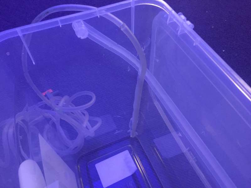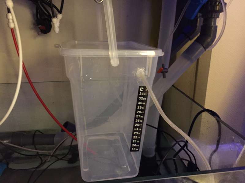 Først bores der et hul til vand ind i den ene side af spanden. Dette er hullet hvor vandet fra dit akvarie drypper ind.