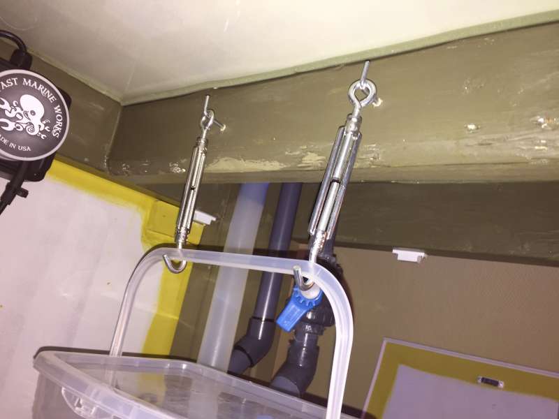 Jeg har fastgjort et par skruer under bordet hvori der hænger de her to spænder der holder spanden :
