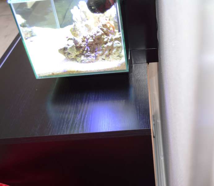Som det ses her, er det originale LED lys ikke særlig kraftig og der er mange mørke områder, specielt oppe i hjørnerne kommer lyset ikke ud. Derimod kommer de 2 x 3W pærer og 10W Royal Blue helt ud i hjørnerne, og giver et meget kraftigere lys. De hvide og blå kan tændes individuelt. P.t har jeg lagt en blæser løst oven på kassen for at køle den blå en smule, indtil jeg finder en strømforsyning som har lidt mindre power. Skummeren er placeret i hængefiltret og sidder fast med en magnet. Pga. højden af skummeren, er der lavet hul i toppen af lyskassen. For at beskytte lampen er der lavet en lille "splash guard"