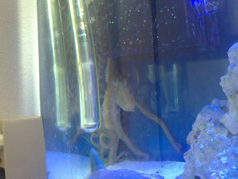 Hey så fik jeg mig endelig en Reef Octopus Sp hjem fra DeJongMarinelife.nl (gennem Moby - DeepOcean.dk), og i kan tro den er spændene. Startede akvariet op fordi det alligevel bare stod og samlede støv, og jeg altid har haft en drøm i maven om en blæksprutte i hjemmet. Så for ca halvanden mdr siden fyldte jeg mit gamle 102l akvarie med buet front op med nyblandet saltvand, en pose levende sand (fiji pink), et tunze nanoreefpack jeg havde liggende, et gammelt 50w varmelegeme samt en gammel Hydor cirkulationspumpe (På omkring 2800 mener jeg) og nogen gamle døde sten jeg havde liggende fra et tidligere setup, som fik en grundig skylder/spuler/skrubber over flere dage i kogende og alm ferskvand. Det hele blev så poddet med 2 godt levende sten fra mit andet kørende akvarie samt lidt Zeo Bak. Af lys over har jeg valgt kun at have to stk 24w t5, et blåt og et actinic, da dyret jo er nataktivt, men overvejer dog lidt at finde noget mørkere belysning, da jeg ellers ikke ser ret meget til den. I tunze filteret blev der smidt aktivt kul, rowaphos og filtervat, og det kører jeg stadig med. Bliver skiftet engang månedligt. Har ik haft noget særlig indkøring, men efter et par uger og nogen grimme brune alger blev der smidt en 4-5 godt voksne turbosnegle i som virkelig har gjort deres arbejde bedre end jeg havde forventet. Ydermere har de ynglet godt, og sammen med sprutten blev der introduceret 4 levende chromis, 3 eremitter og 6 assorteret størrelser nasarius snegle, så sprutten har lidt at jage naturligt af, udover frostfoder som jeg vil smide ned til den engang eller to ugentligt indtil videre. Er ikke selv helt klar over racen på sprutten, så hvis en af jer har en ide må i meget gerne fortælle hvad i tror det er for en. Imens vil jeg søge videre på nettet om den.