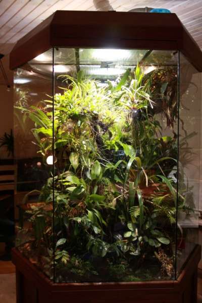 Allerede dengang startede jeg sideløbende op med farvefrøer, og disse har de seneste 20 år taget helt over, mens akvarierne blev faset ud. Frøerne har jeg stadig - blandt andet i dette fritstående stueterrarium, der er 100% DIY: