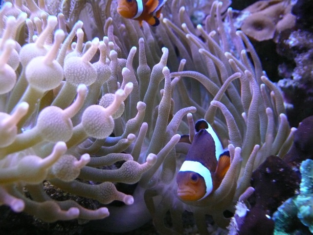 For et par dage siden besluttede jeg mig for at fodre anemoner med nogle optøede rejer, og sørme efter et par timer have den ene anemone delt sig! Så nu er der fire anemoner-én til hver af klovnene