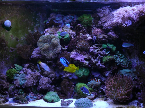 Her kommer lidt billeder af min balje som har kørt i lidt over to år. Akvariet er et hjørneakvarie der måler 120 lang, 70 dybt og 65 højt. Sumpen er 150 liter med caulerpa og levende sten.