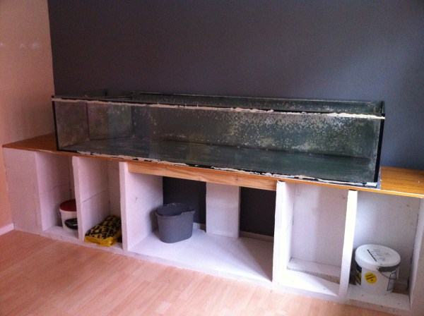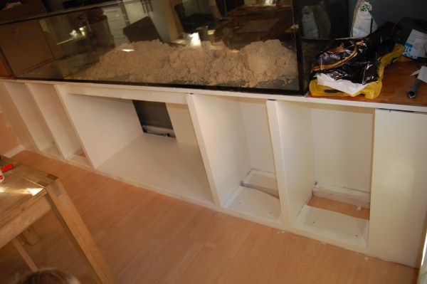 Møbel: væg til væg, bygget i multiplader og træ, med rum til sump i midten.