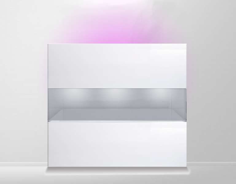 Så har jeg leget lidt med designet af selve møblet og akvariet. Det blå lys er LED lys der skal monteres bag lyskassen mod væggen. De forskellige farver og styrker kan så styres med en fjernbetjening.