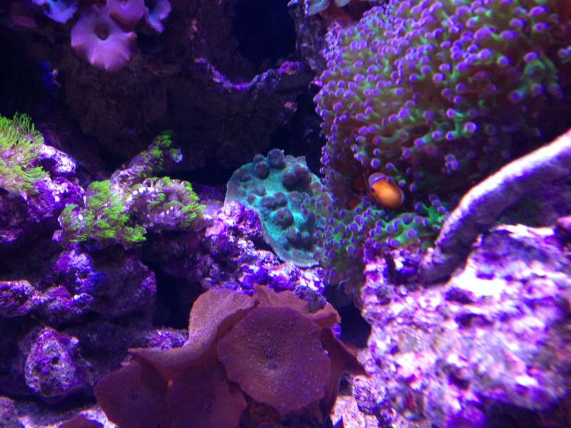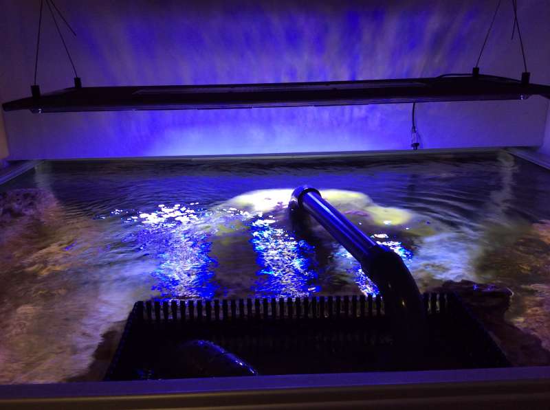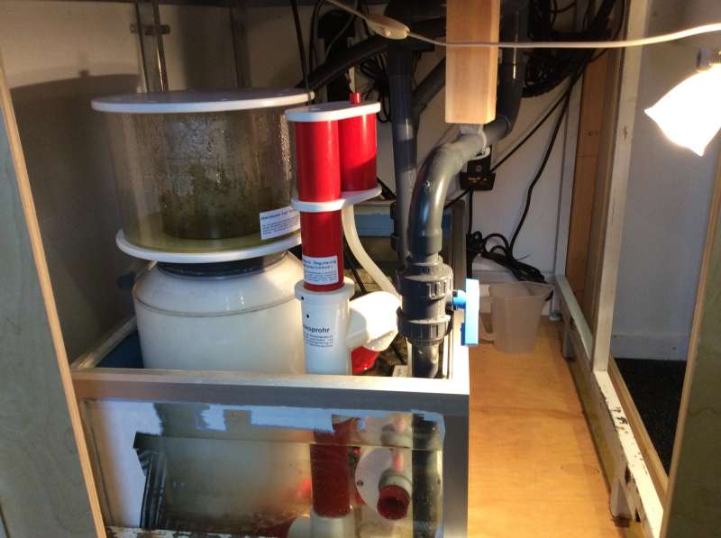 Akvariet er 100 cm bredt, 80 cm dybt og 70 cm højt = 560 L. Som sump har jeg nedenunder et gammelt dyrehandler-akvarie fra Planteimporten på 80x50x35 = 140 l. Sumpen er indrettet med skummerrum, refugie, returrum og ferskvandskammer. Det meste af vandet løber til skummeren, en smule i refugiet og det hele bliver sendt retur af en Red Dragon 6500.