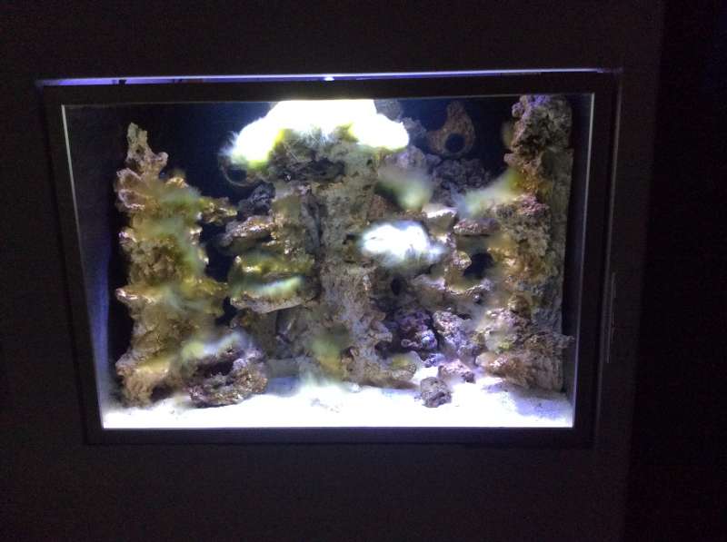 Akvariet står i bryggerset og man kan så se forruden fra køkken og spisebord. Jeg har ikke meget plads at gøre godt med i bryggerset men der er dog både vand og afløb. Overløbet sidder i midten af bagruden og det har jeg dækket med to vinkler af aquaroche keramik. Herudover har jeg et stykke keramik i hver side samt en søjle i midten. Jeg kan godt lide 3D effekten jeg får ved at noget er skjult bag søjlen og at fiskene så kan svømme rundt om den. Samtidig skjuler den returen som sidder som spraybar bag på midtersøjlen. Jeg er klar over principperne i det gyldne snit ikke helt bliver opfyldt her, og jeg ville nok ikke selv have valgt at sætte overløbet i midten. Men i og med at akvariet sjældent ses direkte forfra, men mest skråt forfra tror jeg det nok skal blive fint. I søjlerne og bagbeklædningen har jeg kilet diverse levende og døde sten ind. To af mine fire tunze cirkulations pumper sidder øverst til højre og venstre i et par "tunze-sten". Jeg er ikke sikker på om de bliver ved med det - kan ikke rigtig blive enig med mig selv om de i virkeligheden springer mere i øjnene på den måde end hvis de bare sad i holderen. Det er under alle omstændigheder nemt at lave om.