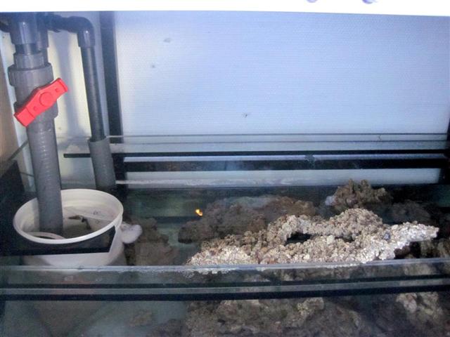 Carsten har lavet et unikt system til mig, der gør det meget nemt at lave vandskifte. Jeg har en glas-beholder på 93*54*40 cm (i alt 200 ltr), der er delt i to lige store dele. Den ene del er altid fyldt med osmose vand, og den anden med vand fra akvariet. Når jeg vil lave et vandskift, åbnes en hane i bunden af saltbeholderen, og vandet fra akvariet løber i afløbet. Herefter fyldes vandet fra osmose tanken over, og salt kommes i. Herefter startes en cirkulations pumpe i salt tanken, og blander saltet op med osmose-vandet. Når dette er gjort, åbnes en hane med vand fra akvariet som så drypper ned i det nye saltvand. Det vand der bliver for meget løber ned i akvariet. Dette gør at det nye saltvand langsomt blandes med akvarievandet over ca. 14 dage. Herefter kan der laves et nyt vandskifte, vandet i saltbeholderen kan hældes ud, og der kan startes forfra.
