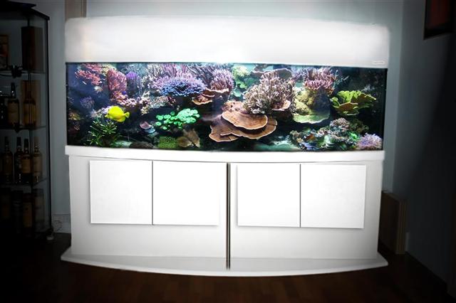 Akvariet: Akvariets mål: 200 cm langt, 70 cm højt, og med buet front (dybden er 60-80 cm) i alt 980 ltr. Selve akvariet er købt brugt på saltvands forum.