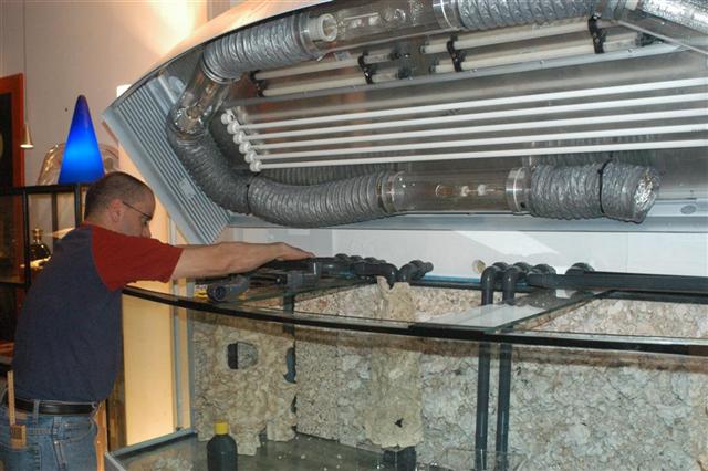 Akvariet har 4 HQI 400W og 6 T5 80W og 4 Profilux LED effekt lys.