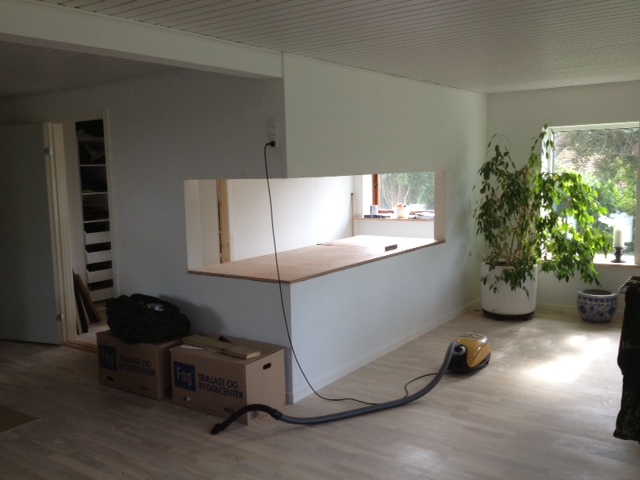 Tillykke med det. Meget imponerende. Jeg bliver nødt til lige at spørge om en ting: Jeg ville også helst have haft et indbygget akvarium, og overvejede på et tidspunkt en hjørneløsning. Jeg opgav dog ret hurtigt ideen da jeg ikke lige kunne se hvordan jeg skulle få et I-jern til at gå rundt om et hjørne og bære væggen ovenover, uden en støtte i hjørnet. Synes det ser ud til at dine vægge også er i sten / gasbeton, så hvordan har du båret dig ad?