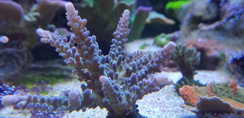 Acropora tortuosa. Købt som fragment fra Tyskland. Jeg har en del forskellige tortuosa, der er af staghorn typen. Jeg har ikke set dem som tabletops. De vokser ret godt, så jeg prøver at anbringe dem bagerst i revet.