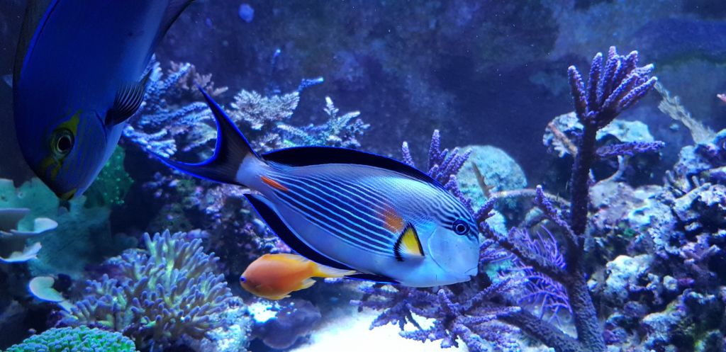 Acanthurus sohal. Jeg købte den af Michael i næstved. Den var blevet for stor til hans 250L. De har ry for at kunne være aggressive. Min opfører sig eksemplarisk, så det er nok individuelt fra fisk til fisk.<br />He he, der er altid en ”linselus” der prøver at komme med på billedet.