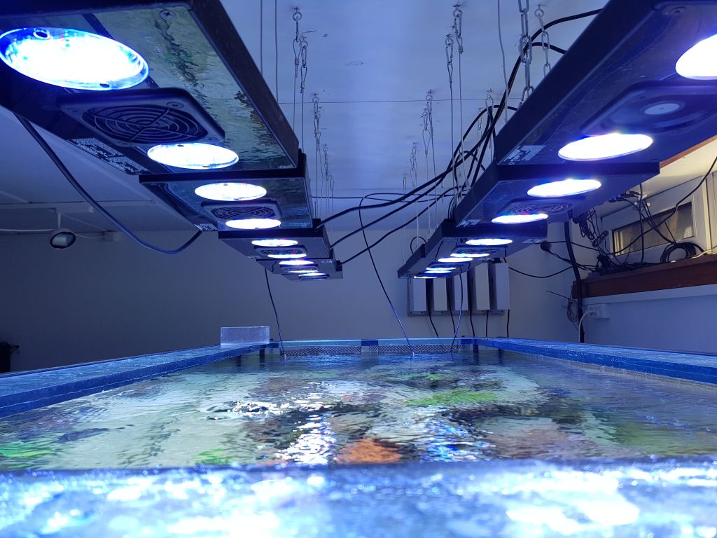 Jeg har 10 stk Radion fra 2012 hængende over. De dækker hele overfladen. Ved sideruderne er revet belyst med mindre lys, hvilket giver mulighed for mindre lyskrævende koraller her. Jeg har bobble koraller, chalice, plademontier og gonioporaer her.