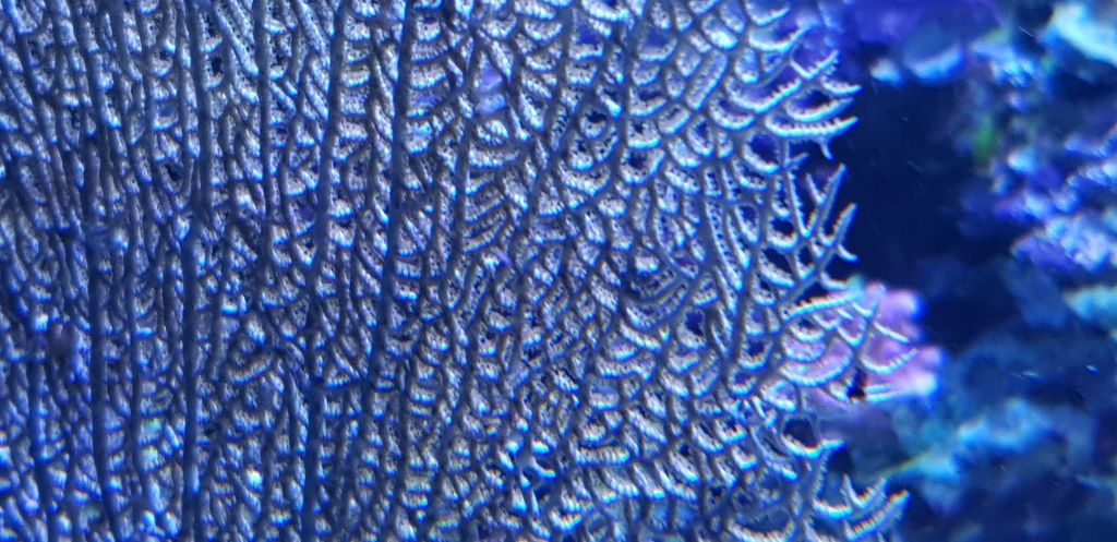 Gorgonia ventalina kaldes også for sea fan (jeg kalder den for en vifte koral) Den er nærmest som en si eller et net. Den fanger ofte cyano der er blæst løs fra revet, derfor er jeg obs på den så jeg kan få det blæst videre. Men nu var der kommet den her algefilm på, nærmest som den jeg ser på ruden efter et par dage.